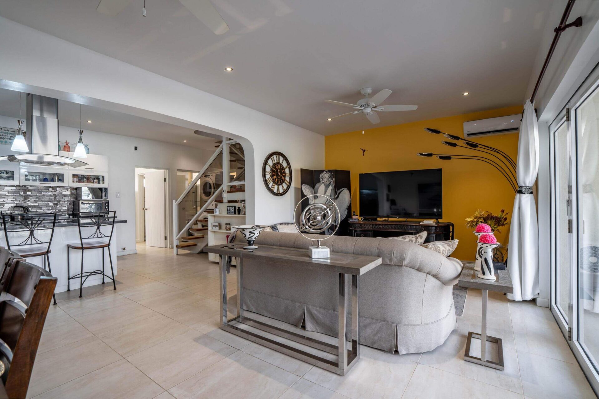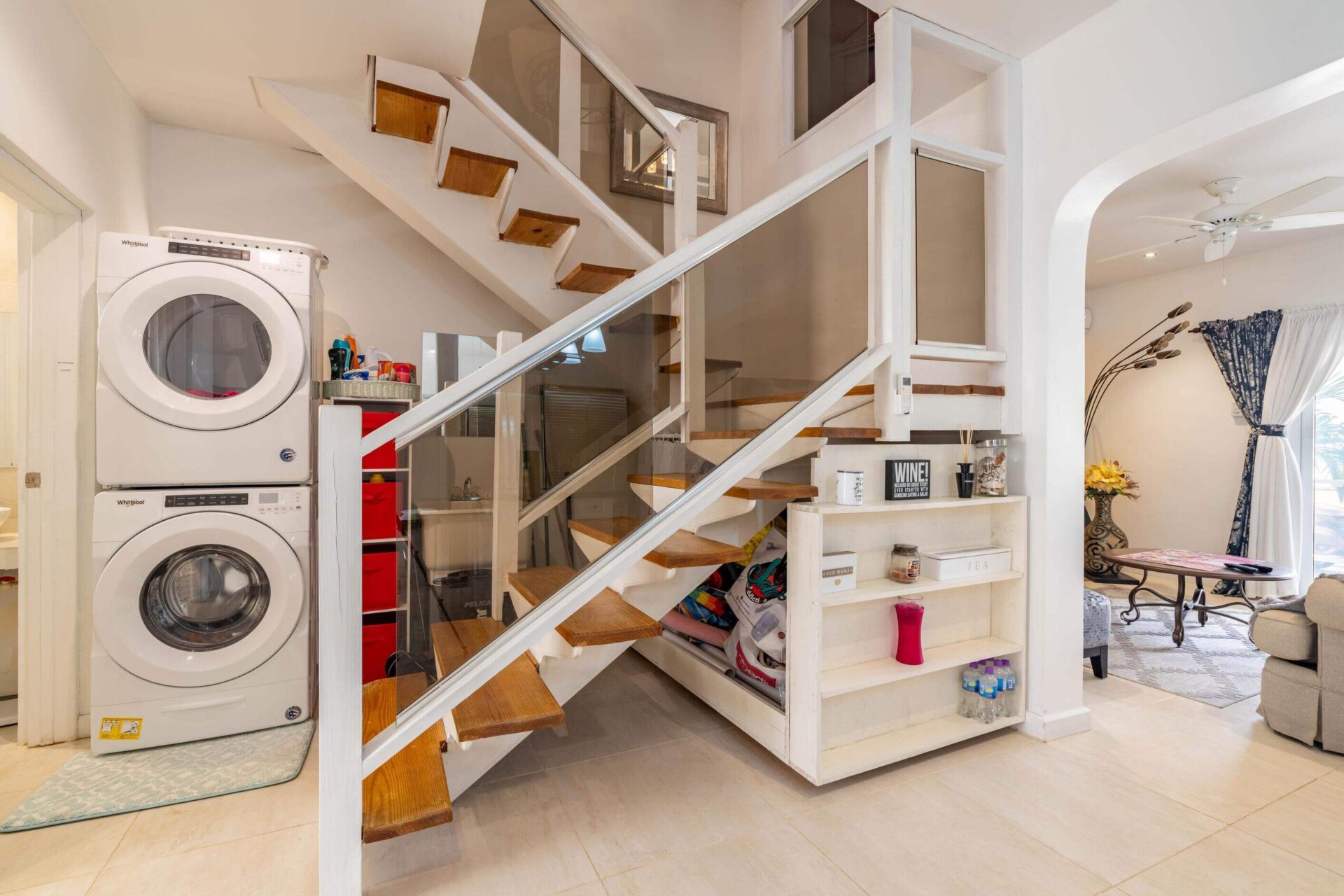 Porcelain tile flooring runs throughout the home. Glass railings and a natural wood staircase introduce warmth and clean lines. Air-conditioning is installed throughout, with ceiling fans for additional comfort.