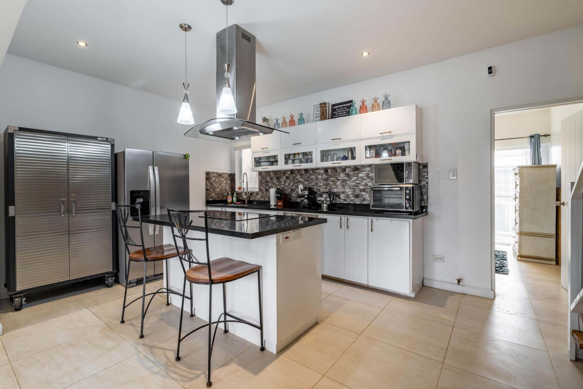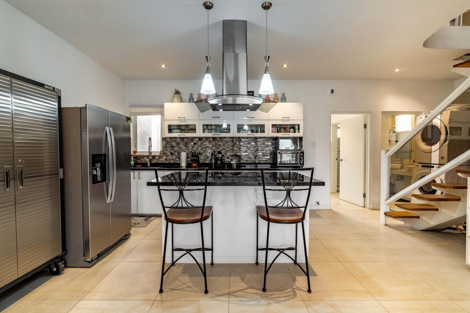 The main level centres around an open-plan living and dining space that flows directly into a modern kitchen finished with granite countertops and an island cooking stove. Stainless steel appliances, including a Whirlpool refrigerator with ice maker, support everyday practicality and short-term rental expectations.