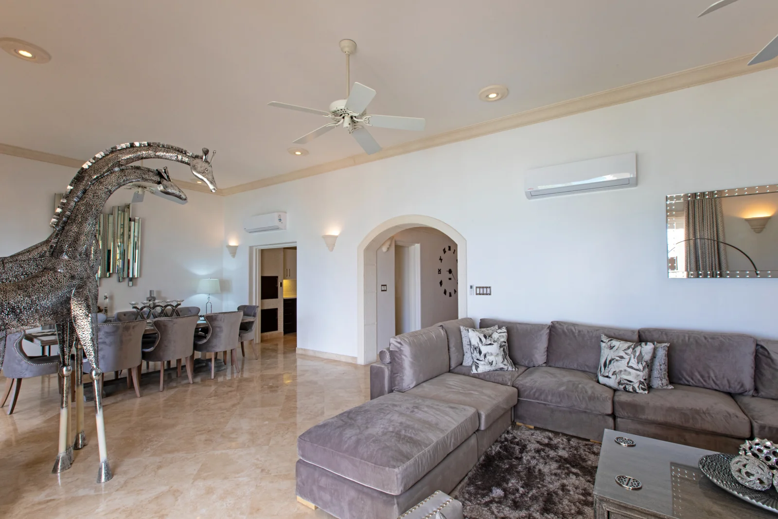 An open-plan layout centres around a substantial kitchen island that anchors the space. Casual breakfasts. Evening cocktails. Hosting without feeling crowded. The flow from kitchen to dining to lounge is deliberate and natural.