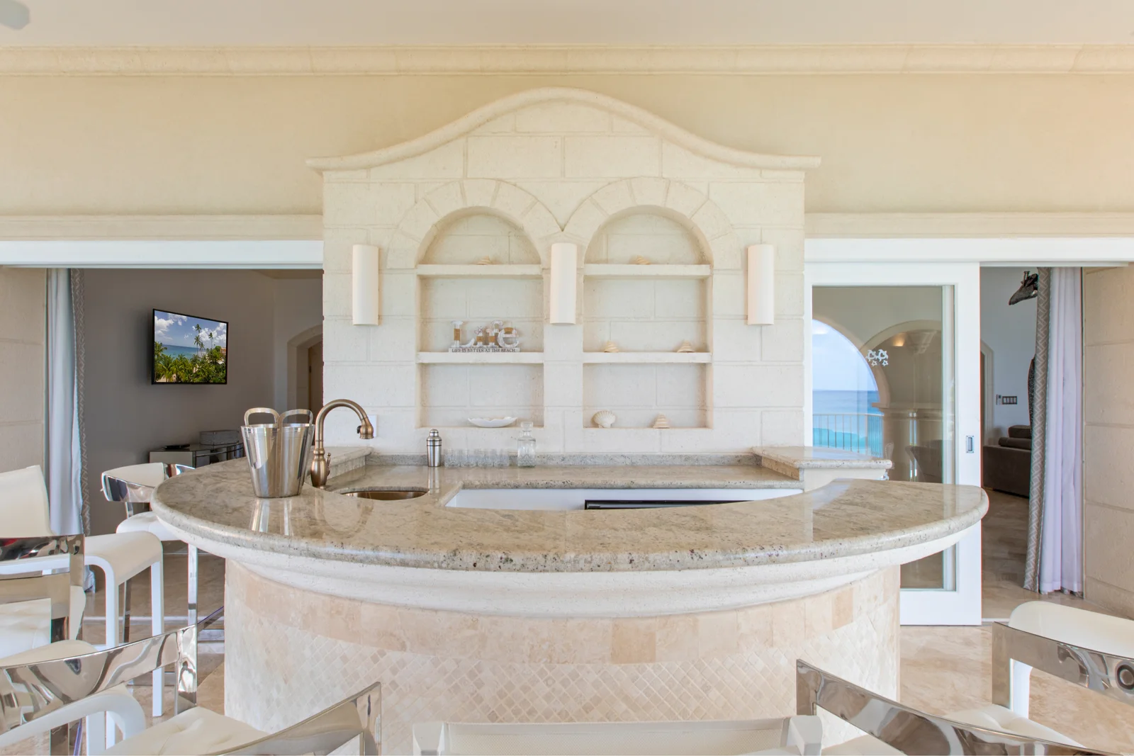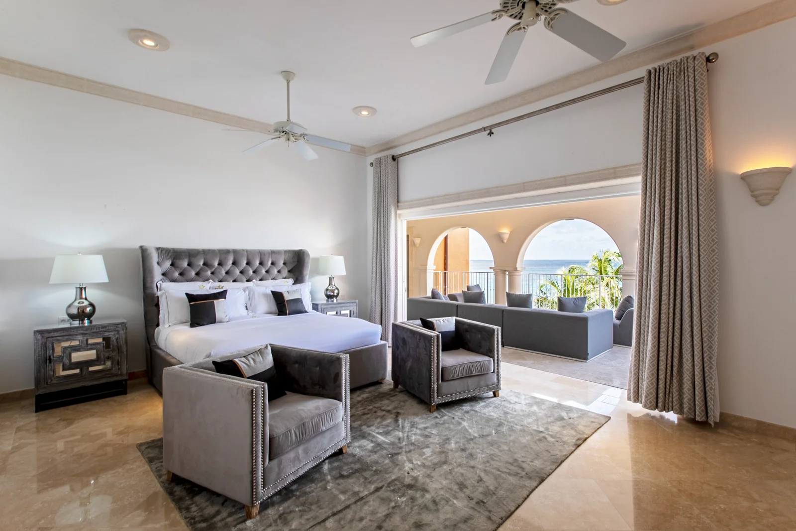 Penthouse 501 at St. Peter’s Bay sits in Building One as a prized end residence. It spans approximately 6,300 sq. ft. across two full levels and has been renovated and fully furnished. From the moment you enter, the sea commands your attention.