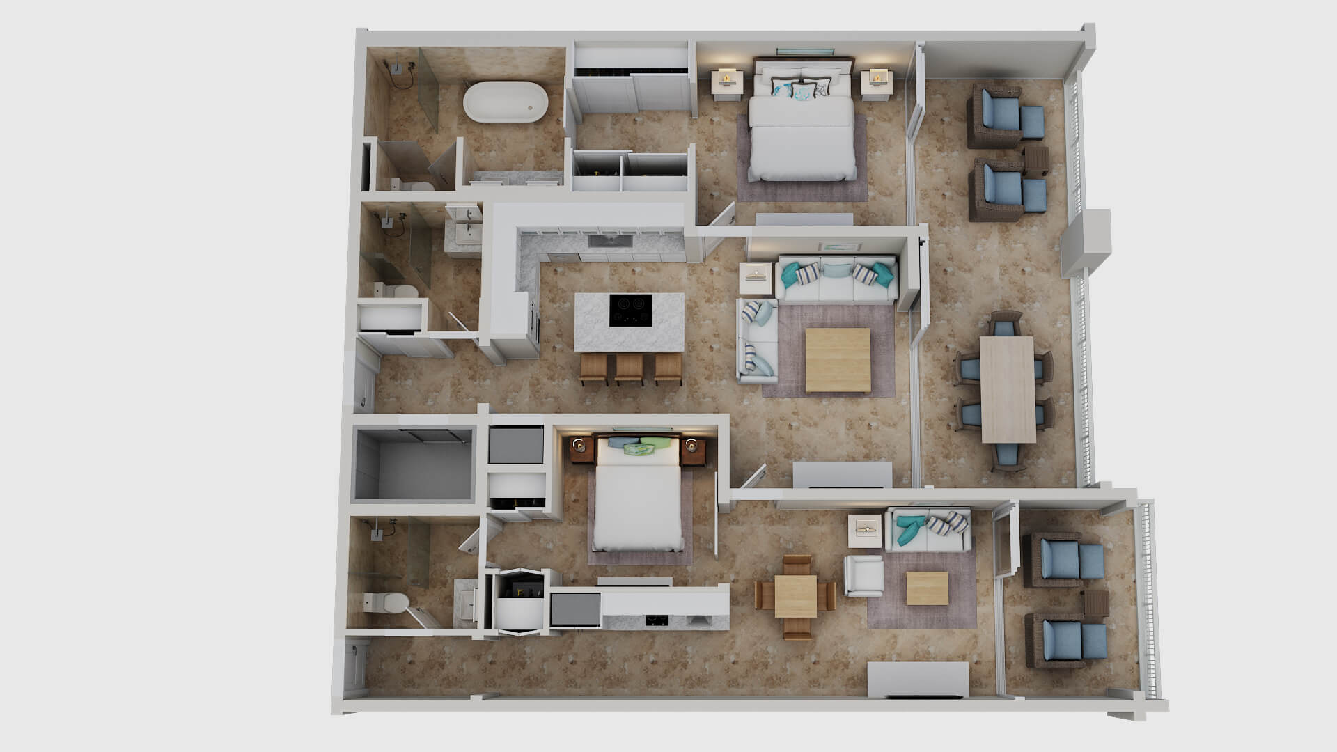The defining feature is the lock-off configuration. One bedroom operates as a self-contained suite with its own kitchenette and bathroom. That means: