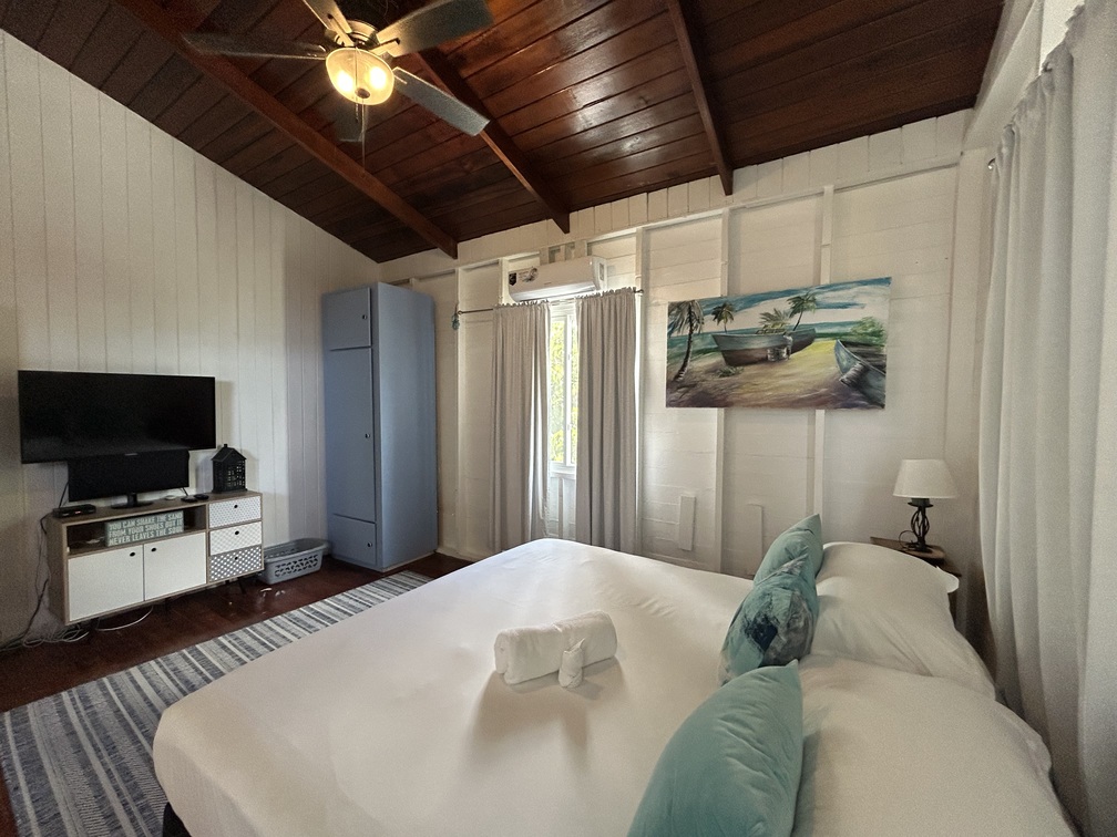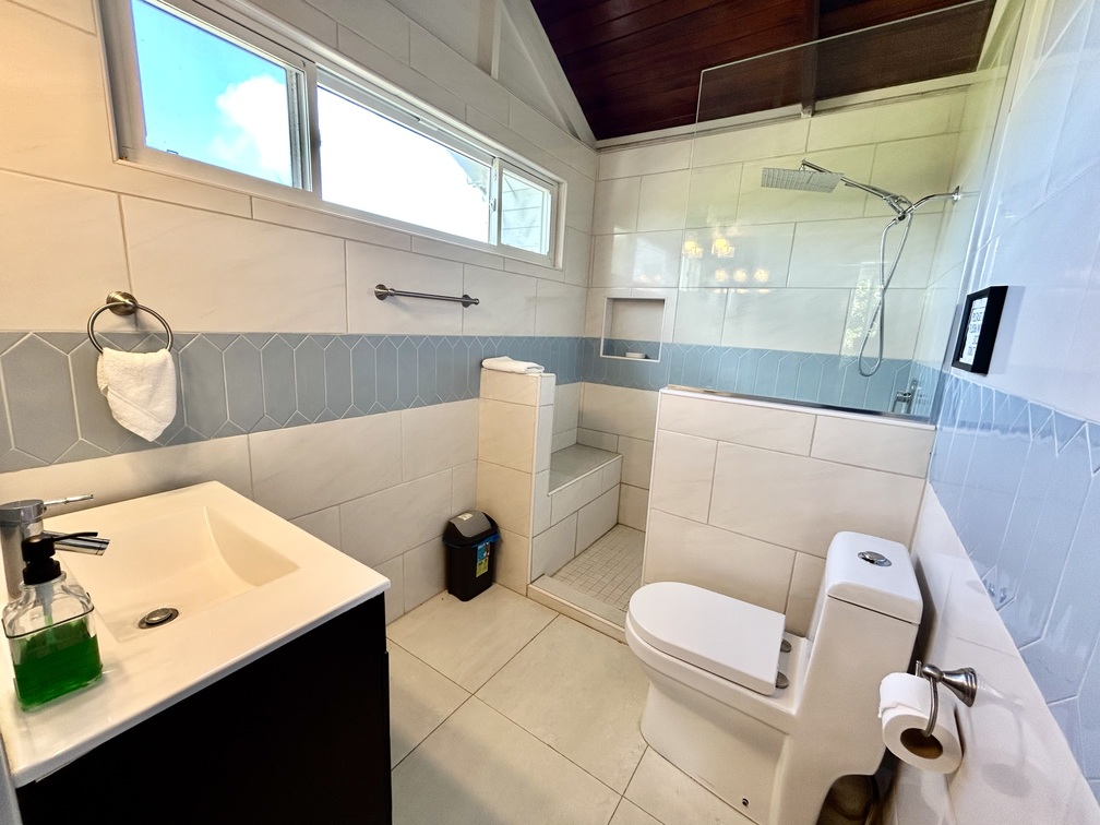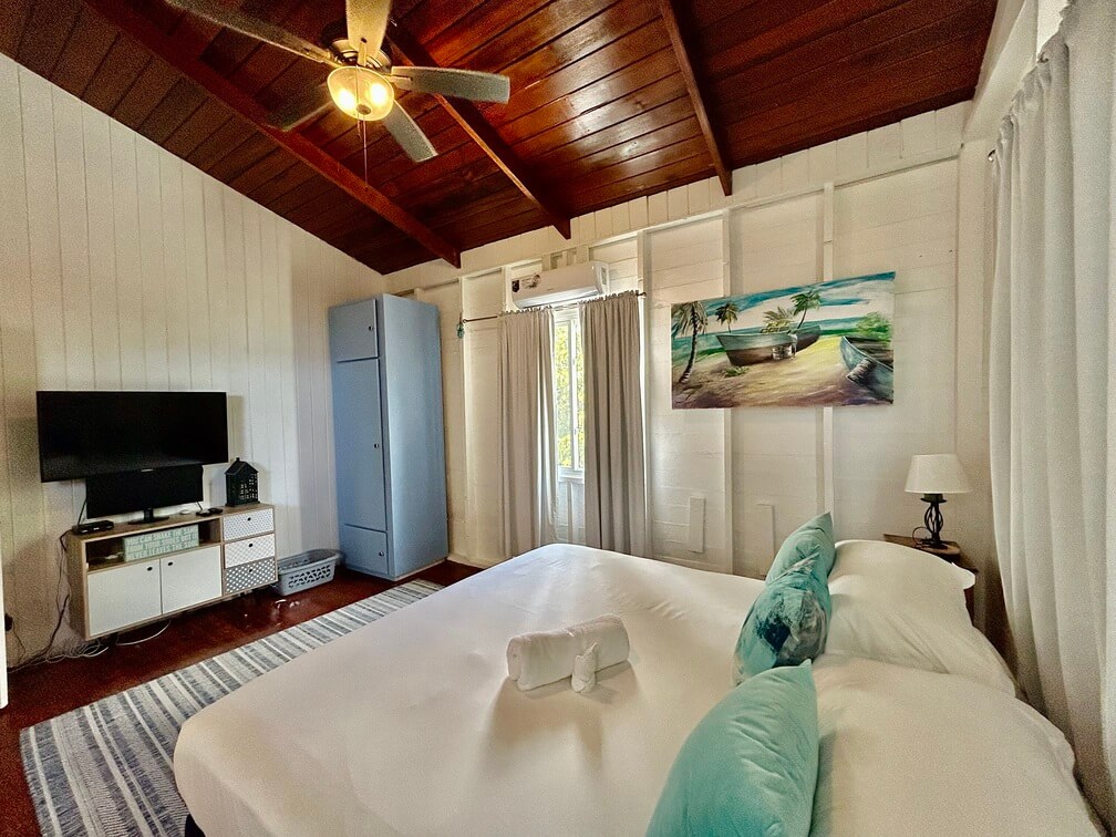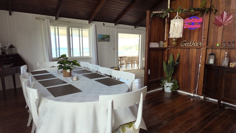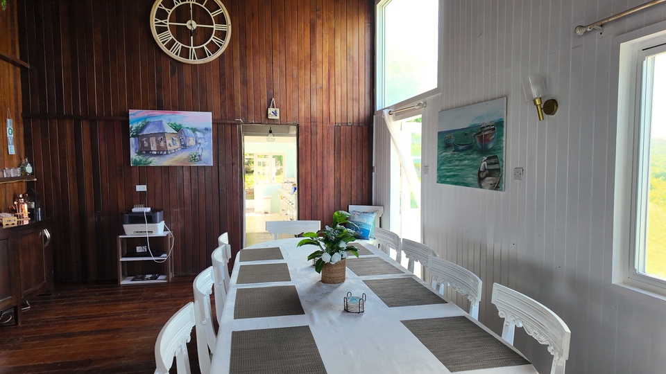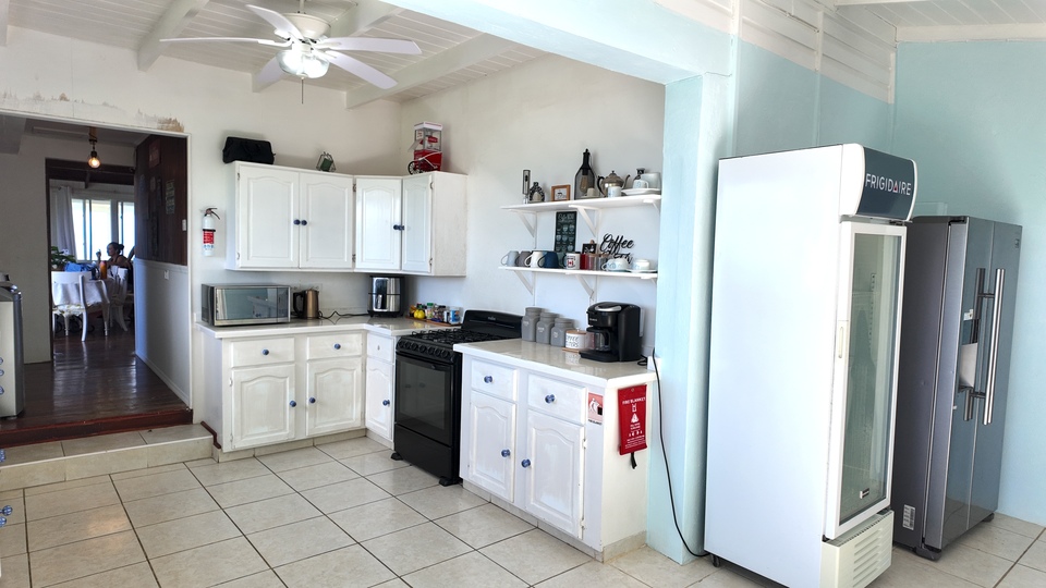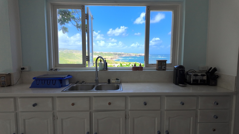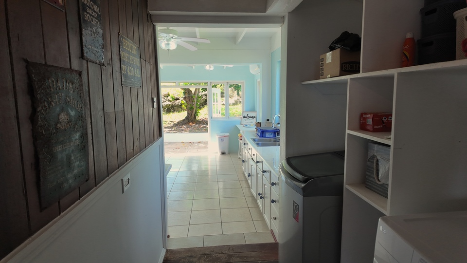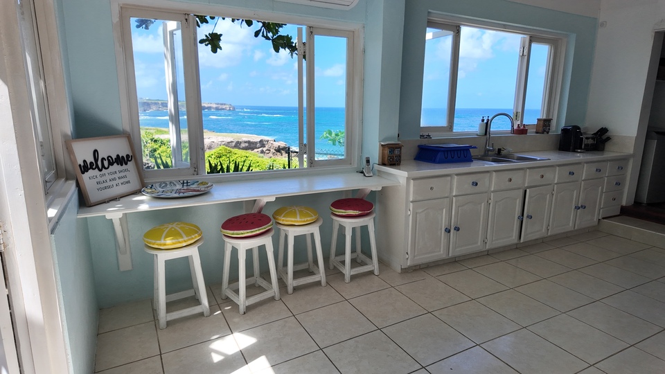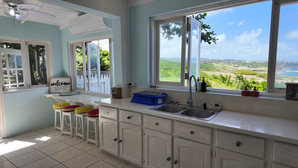The kitchen is practical and well-thought-out. It is air-conditioned, fitted with modern appliances, and includes a comfortable breakfast nook. You get views in two directions here. Ocean to one side. Countryside to the other. A nearby storage room and a dedicated laundry area with a washer and dryer keep daily life organised and out of sight.