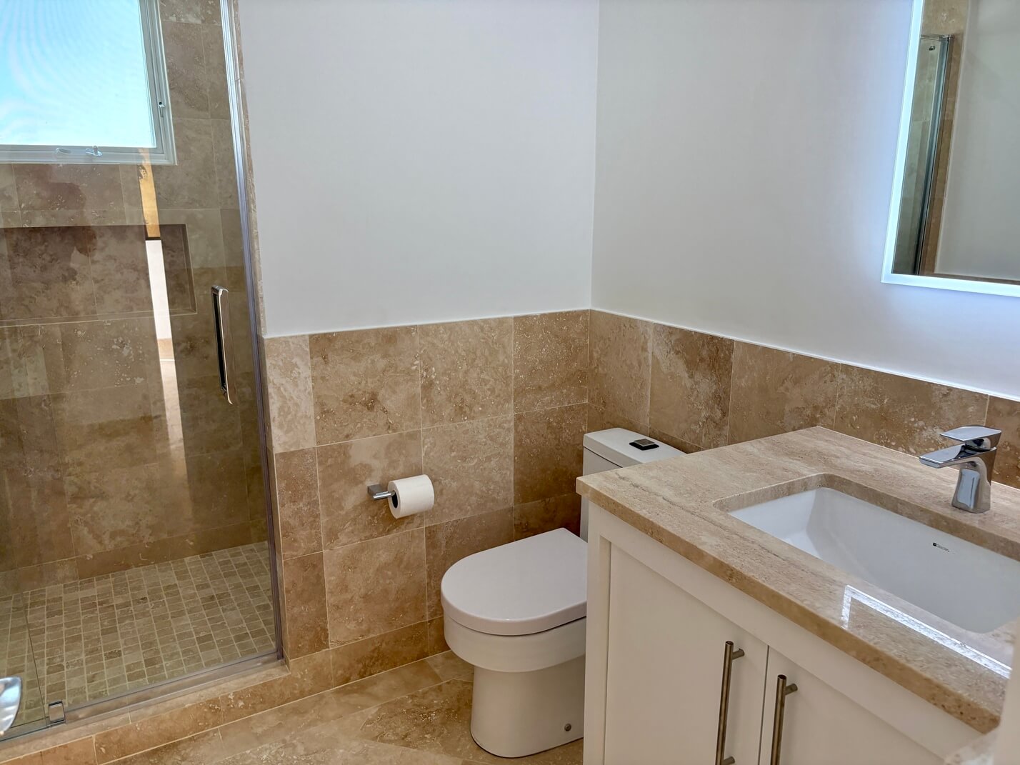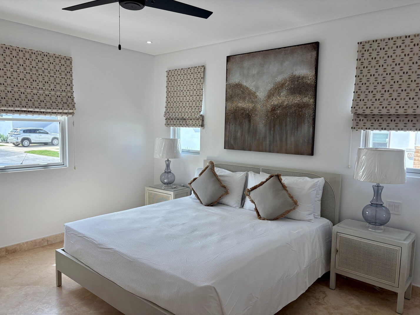 The kitchen is modern, well-equipped and integrated into the open-plan design. Ceiling fans complement the natural airflow, and the home is fully furnished, eliminating setup delays.