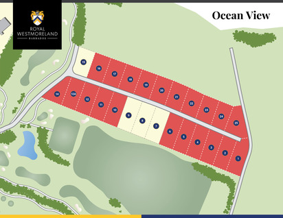 A commanding location within Royal Westmoreland is now available for you to reserve your preferred location. This highly desirable phase one of our three phase development, comprising of Ocean View, Ocean Ridge and Ocean Heights, is breaking ground in 2025 with infrastructure and road construction. Positioned Southeast of the Club House, adjacent to the 18th fairway. Ocean View boasts panoramic, uninterrupted golf and elevated Westerly sea views.
