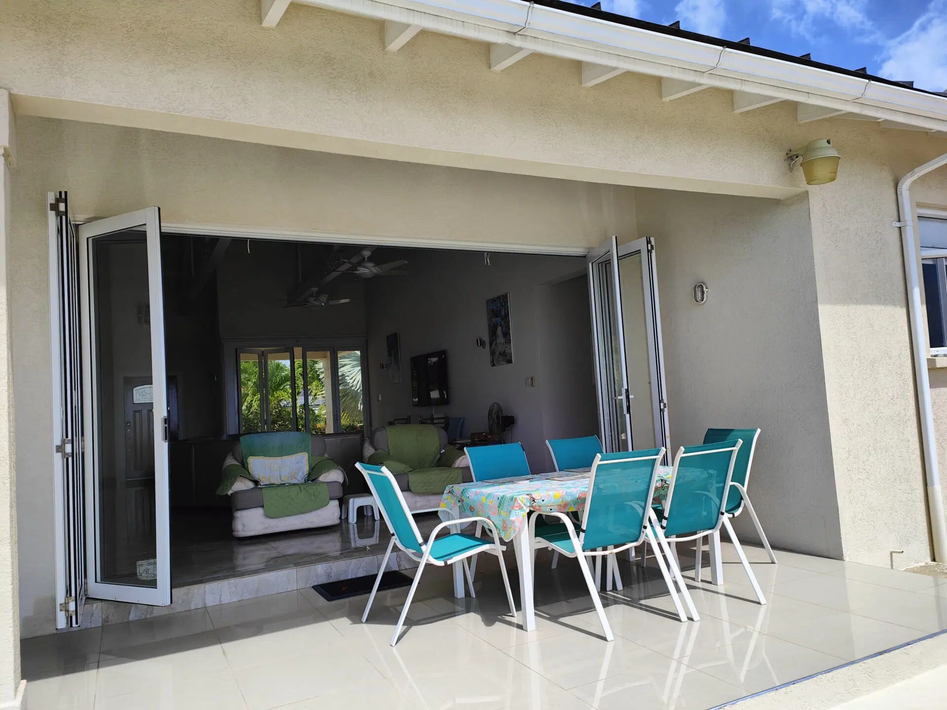 The main living spaces are open plan and oriented for airflow. Large doors extend the interior onto a covered terrace and pool deck, creating a natural connection between the house and its outdoor spaces.