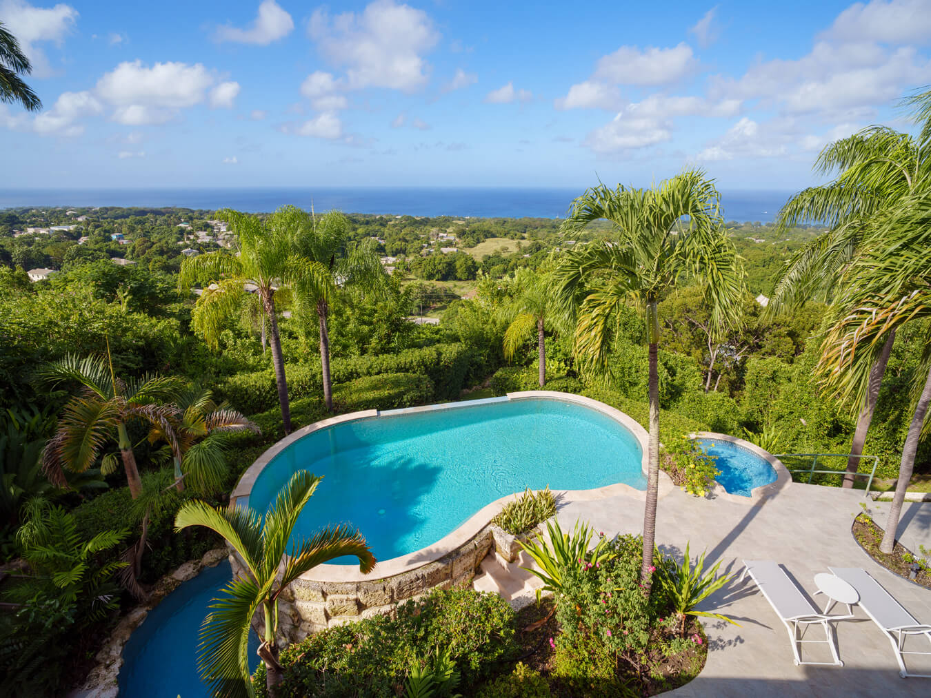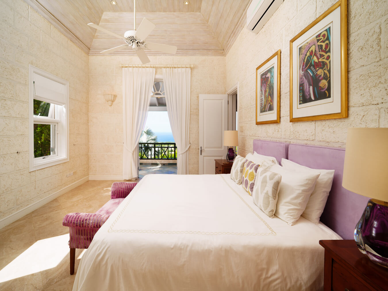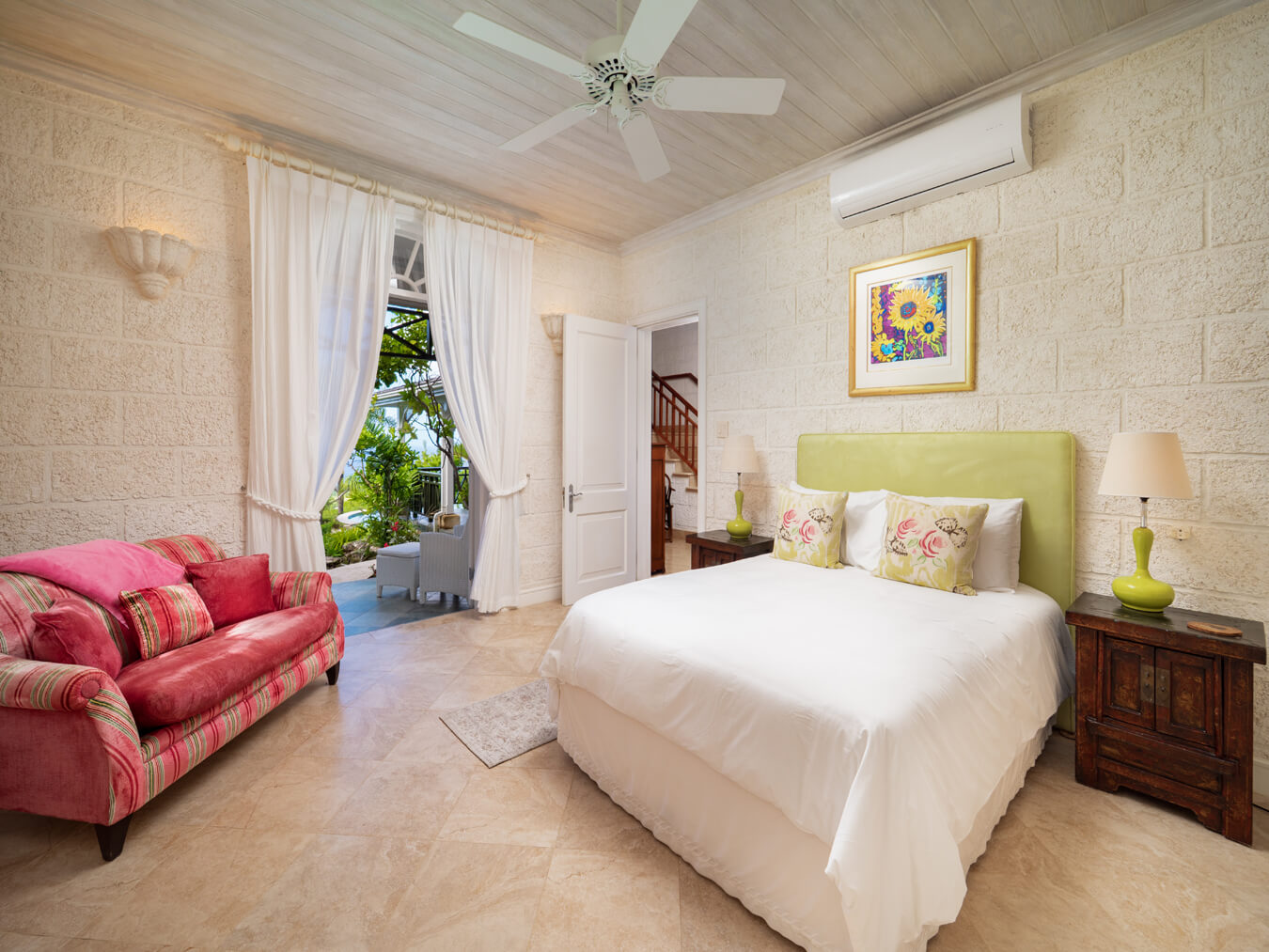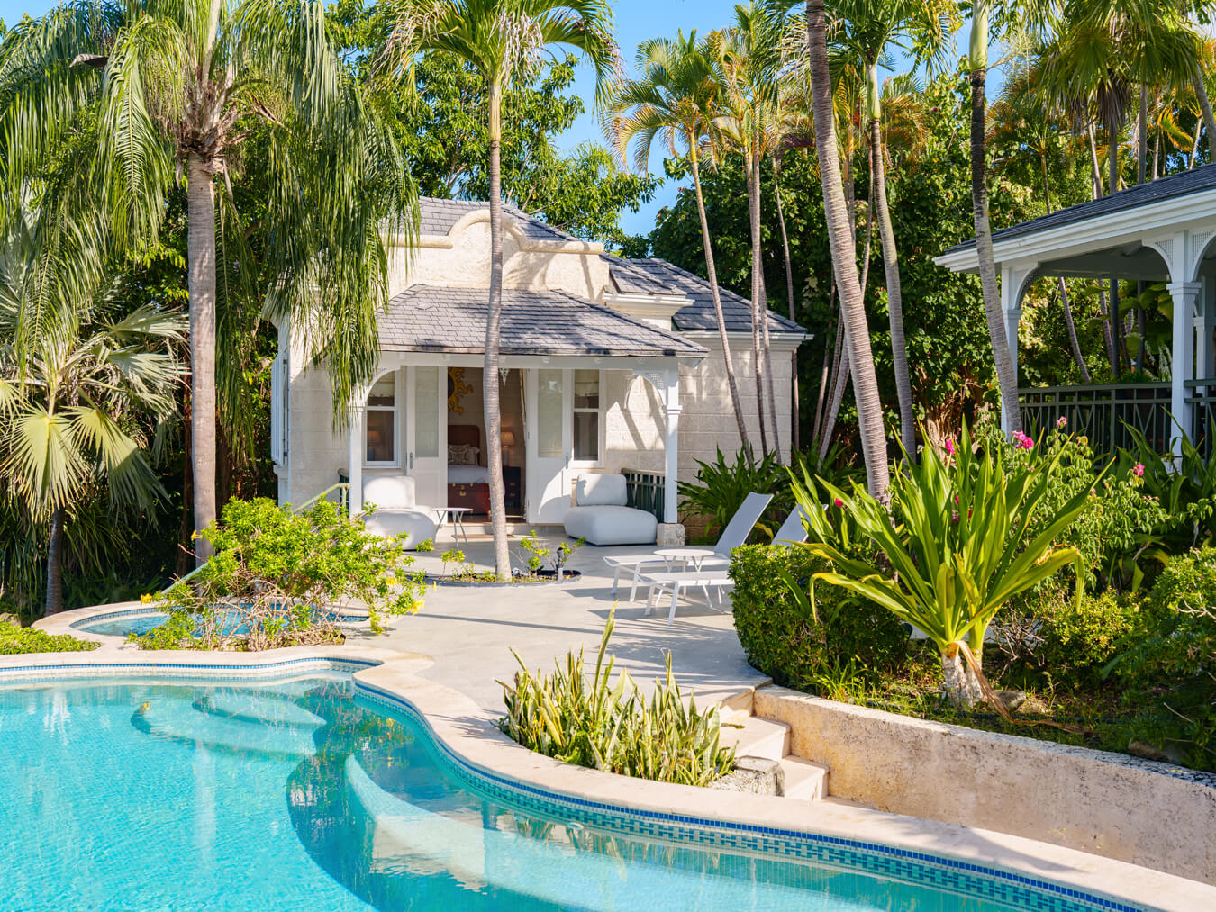 The one-bedroom cottage sits at the northwestern corner of the property. Guests enjoy their own independence and views of both the pool and the sea. It works equally well for visiting family or long-term stays.