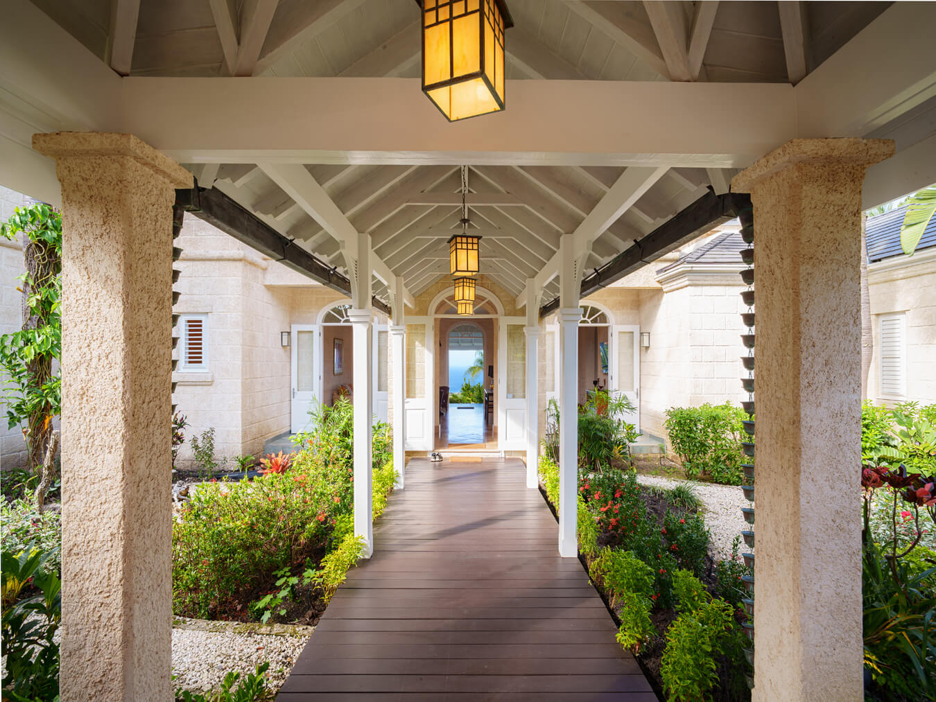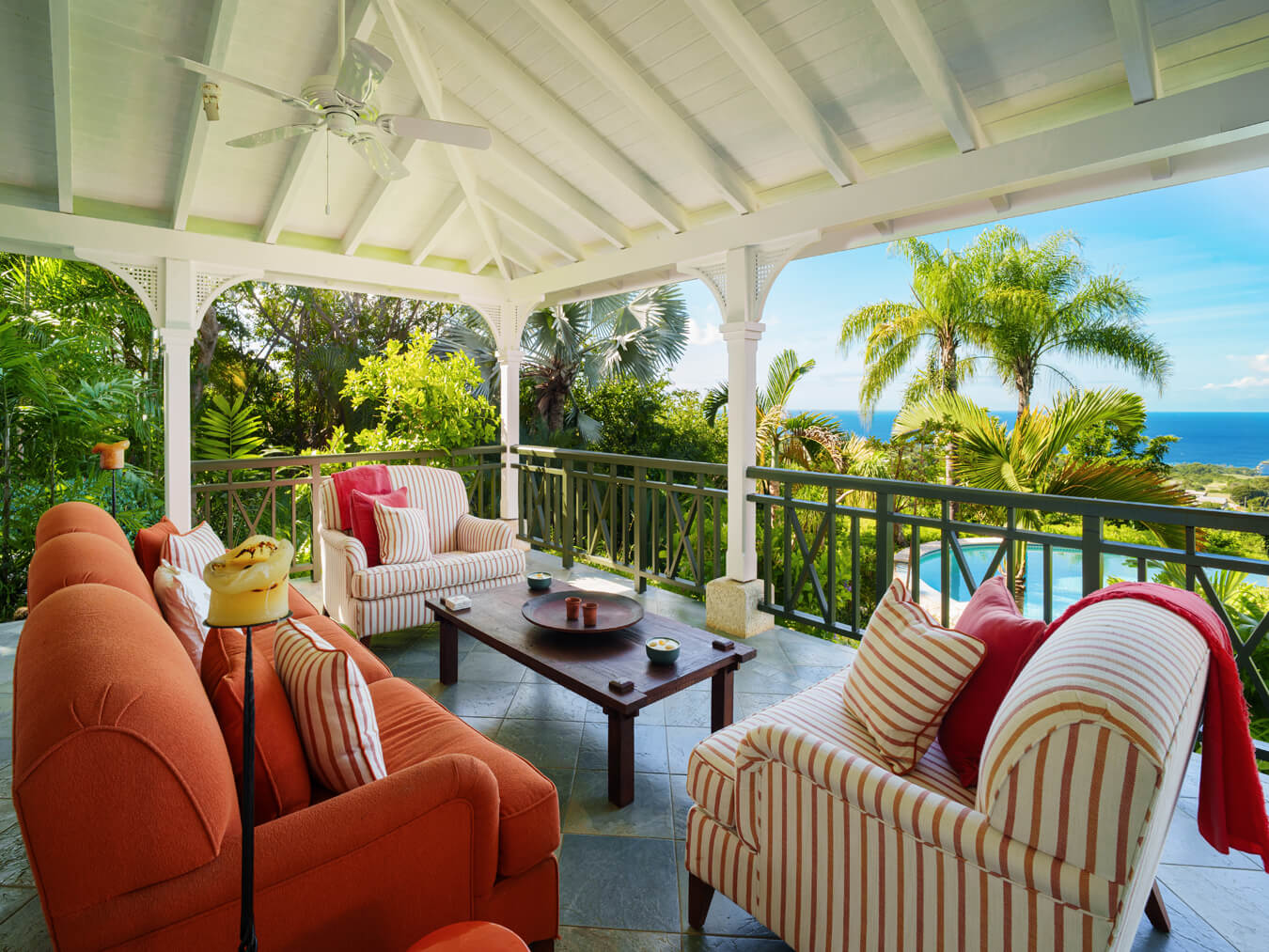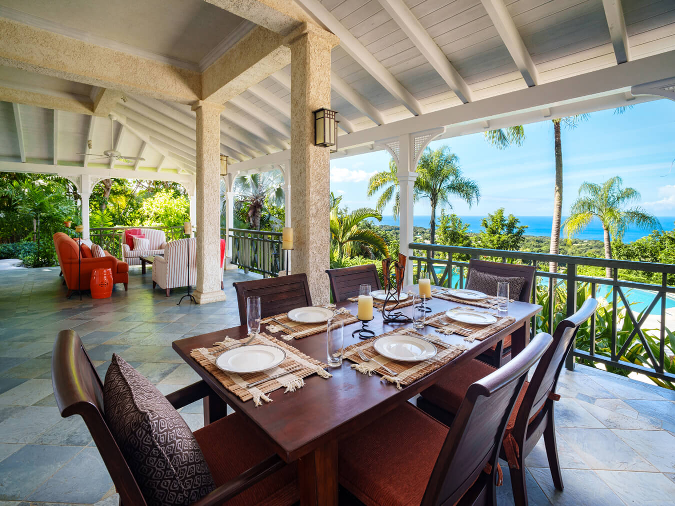 The covered terraces run long and wide, ideal for slow breakfasts, lazy afternoons, or dinners outdoors. Just steps away, the heated infinity-edge pool overlooks the gardens and coastline.