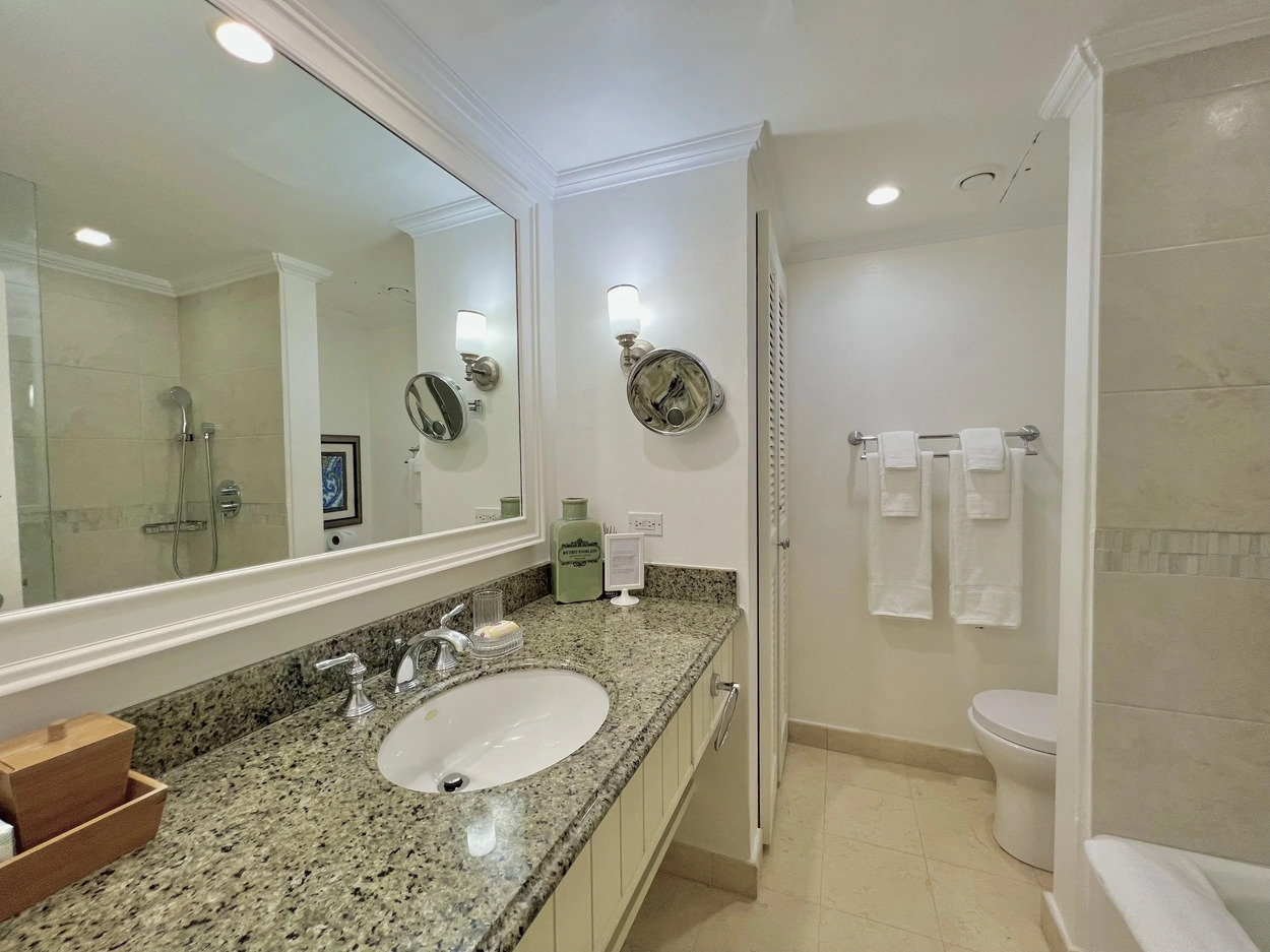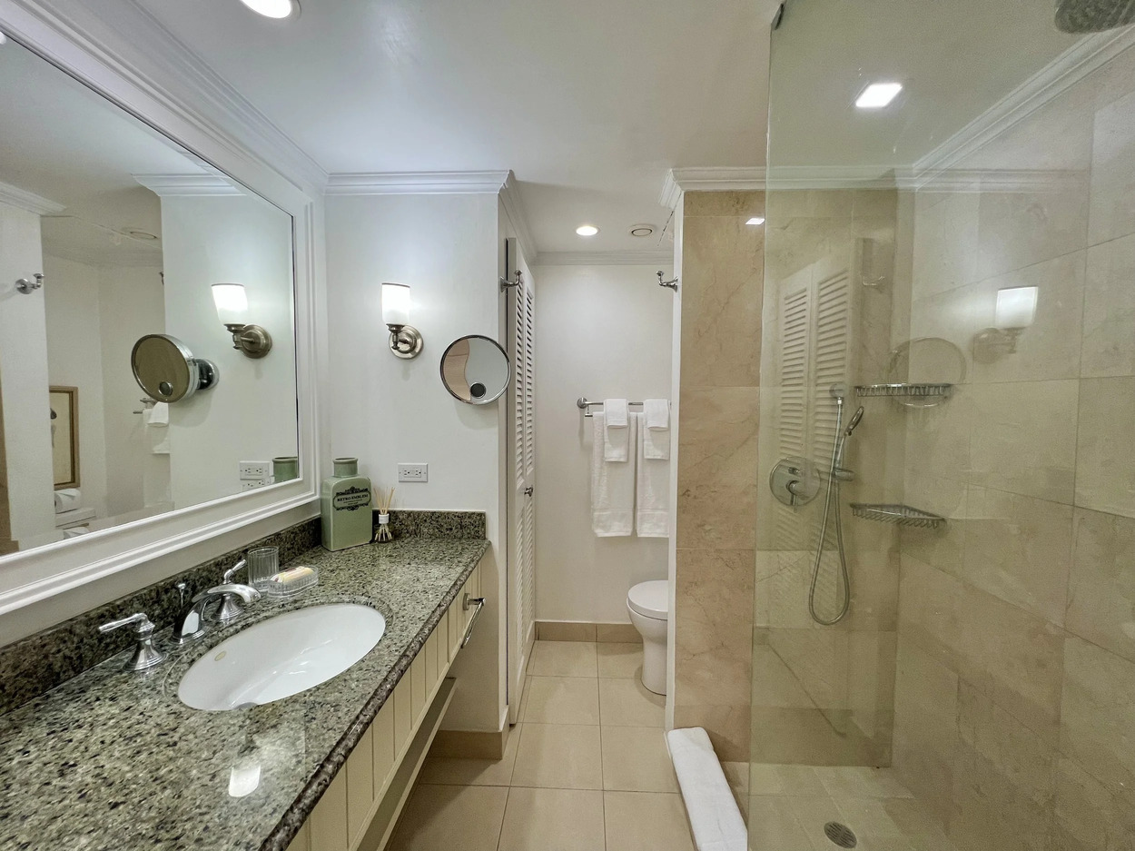 The primary bedroom opens onto the balcony and includes a king bed, ensuite bathroom, and a TV with internet channels. The second bedroom can be set up as a king or two twins, making the apartment ideal for visiting friends, couples, or small families. A second bathroom with a shower/tub combo sits just off the hallway.