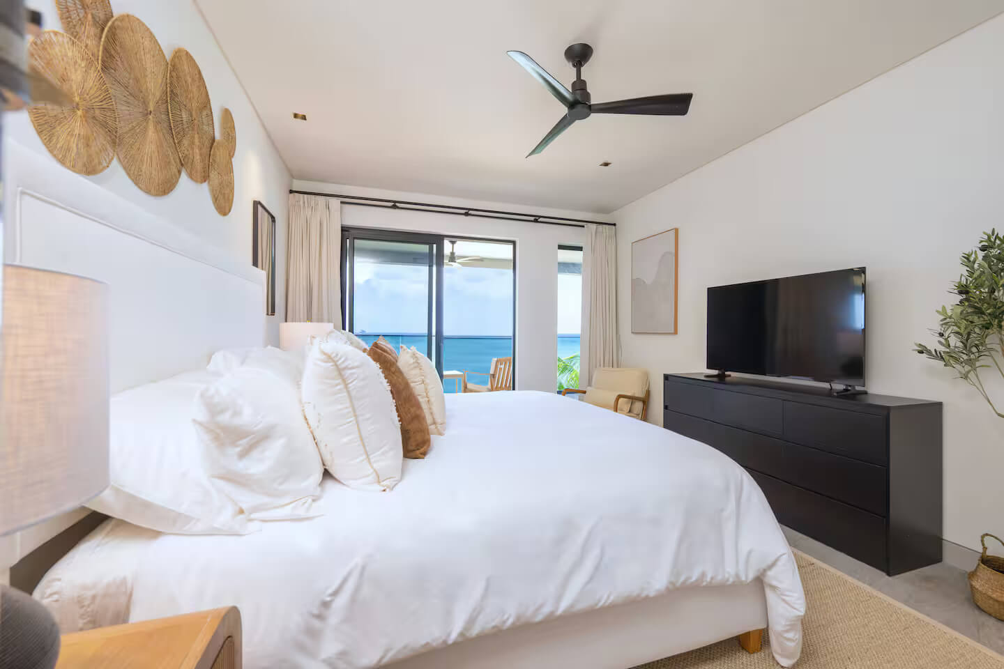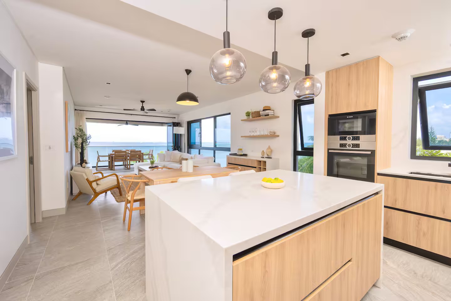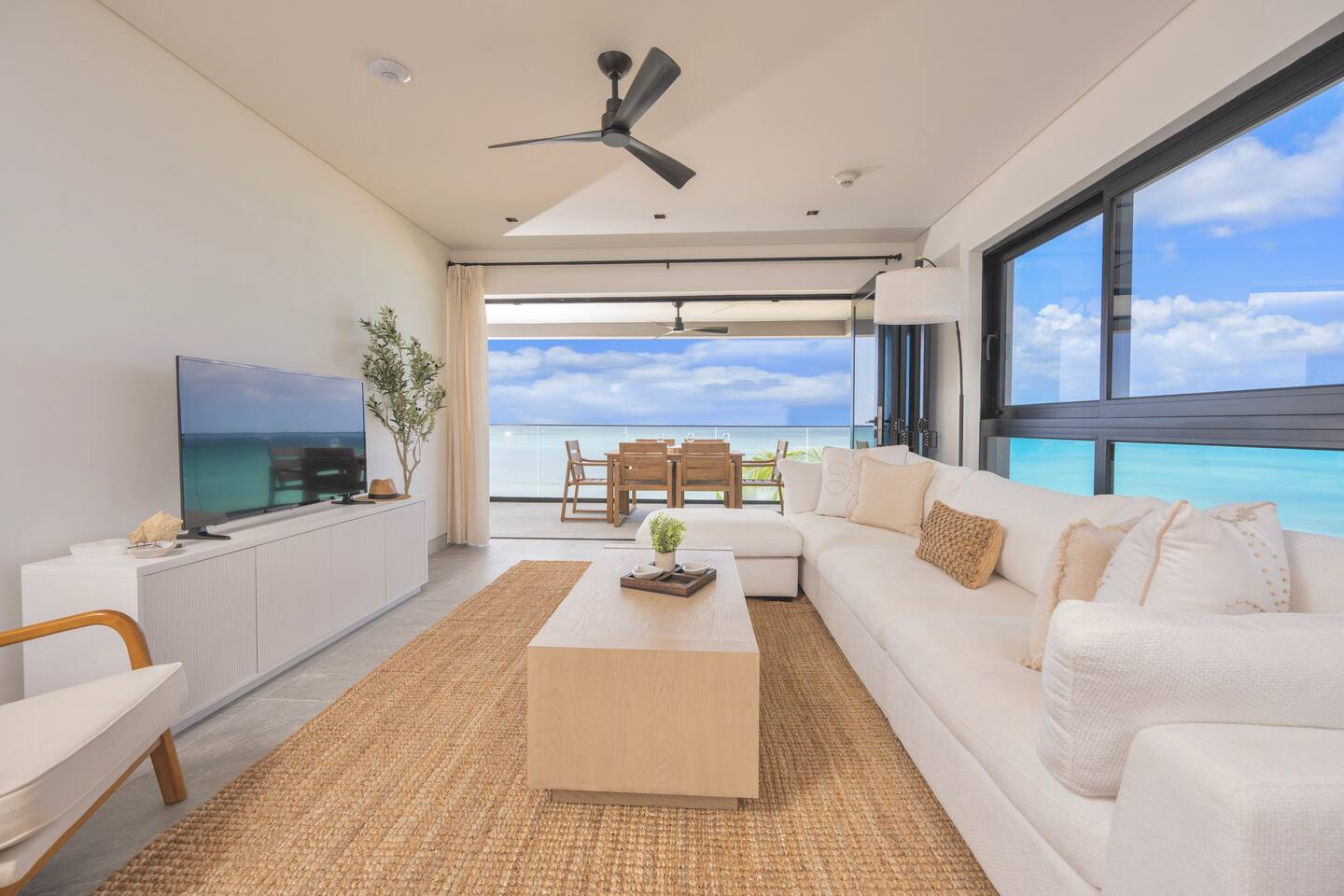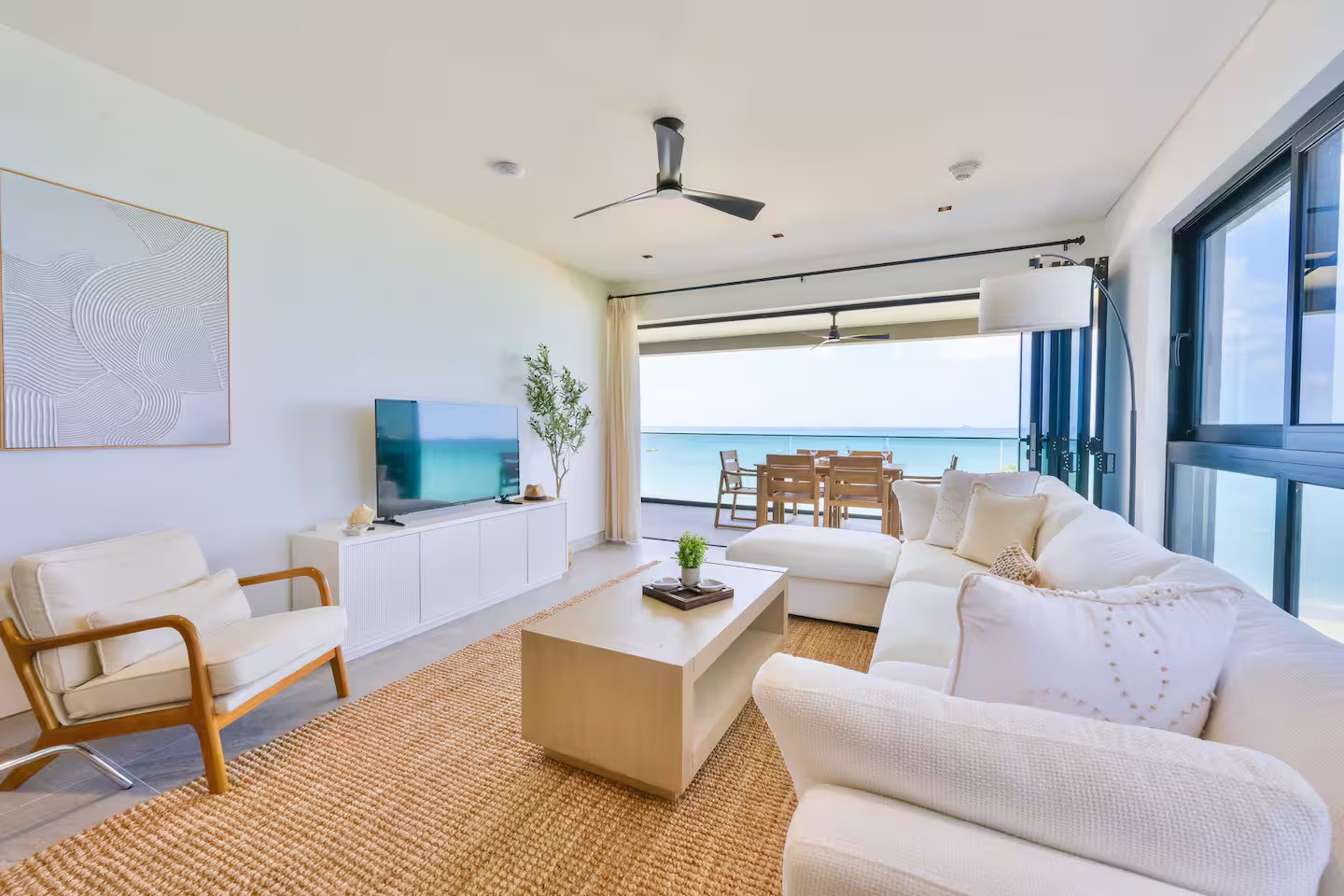Inside, this three-bedroom, third-floor residence leans into a sleek modern design with clean lines, ocean-facing glass doors, and carefully selected finishes that feel both elevated and inviting. The open-plan kitchen and living area flow seamlessly onto the sea-facing terrace. At the same time, the master and guest bedrooms offer complete comfort, each with en-suite bathrooms, air conditioning, and ceiling fans for optimal airflow.