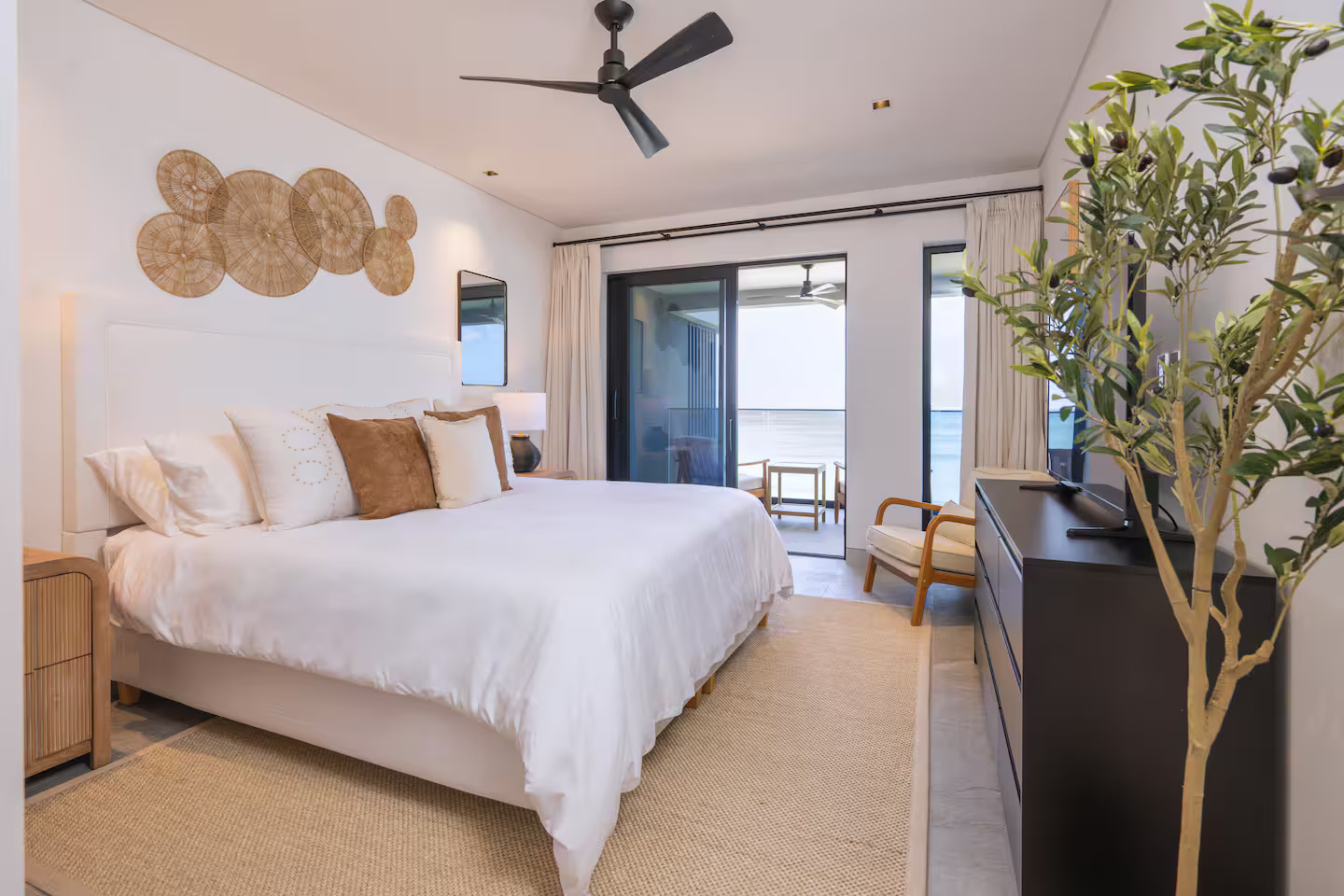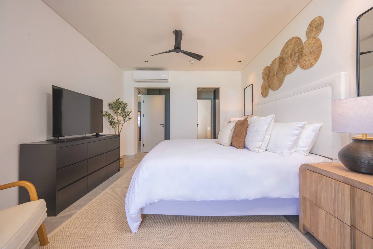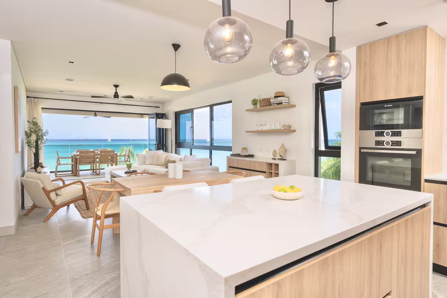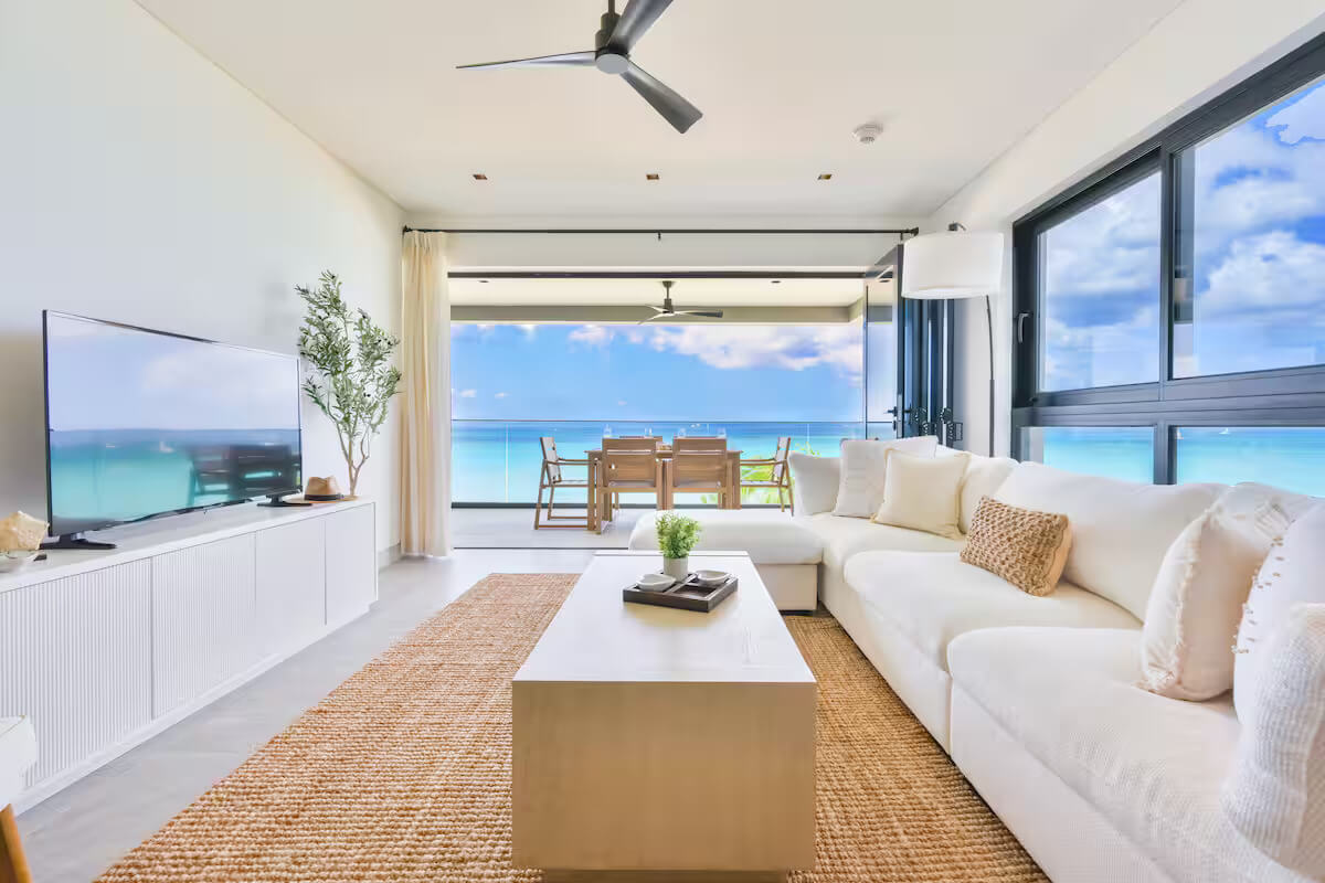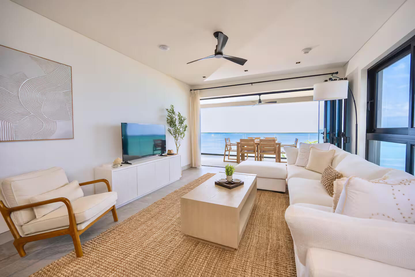 Inside, this three-bedroom, third-floor residence leans into a sleek modern design with clean lines, ocean-facing glass doors, and carefully selected finishes that feel both elevated and inviting. The open-plan kitchen and living area flow seamlessly onto the sea-facing terrace. At the same time, the master and guest bedrooms offer complete comfort, each with en-suite bathrooms, air conditioning, and ceiling fans for optimal airflow.