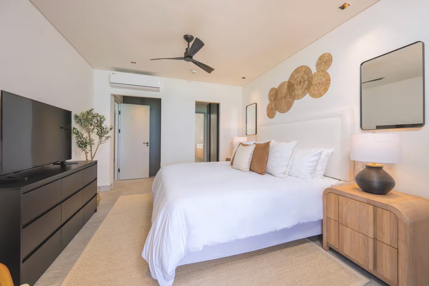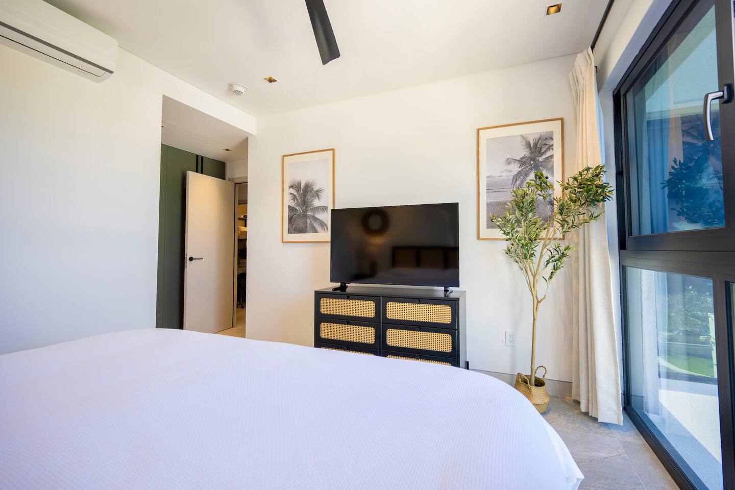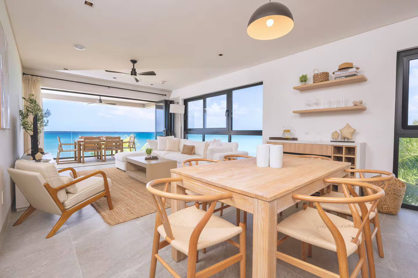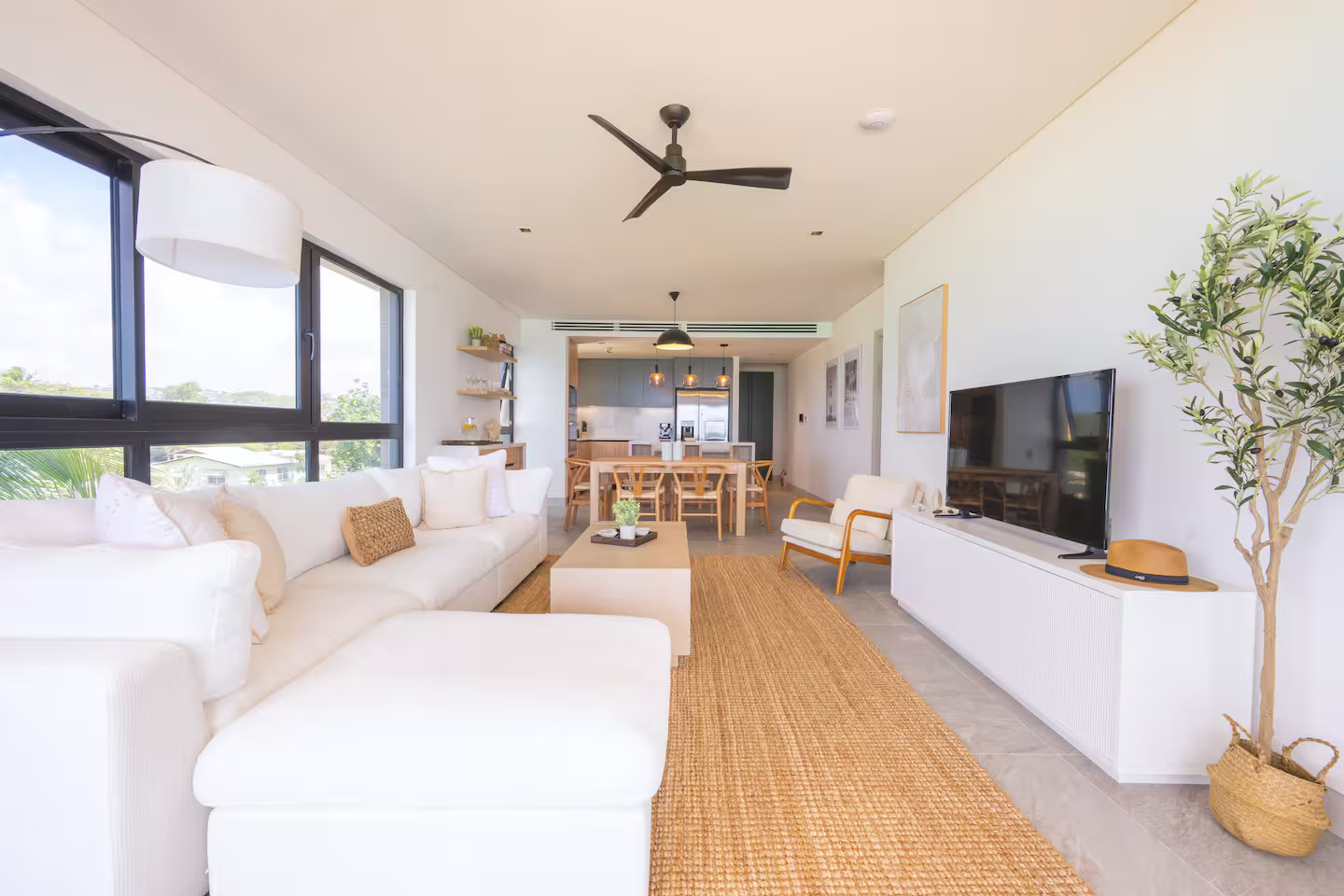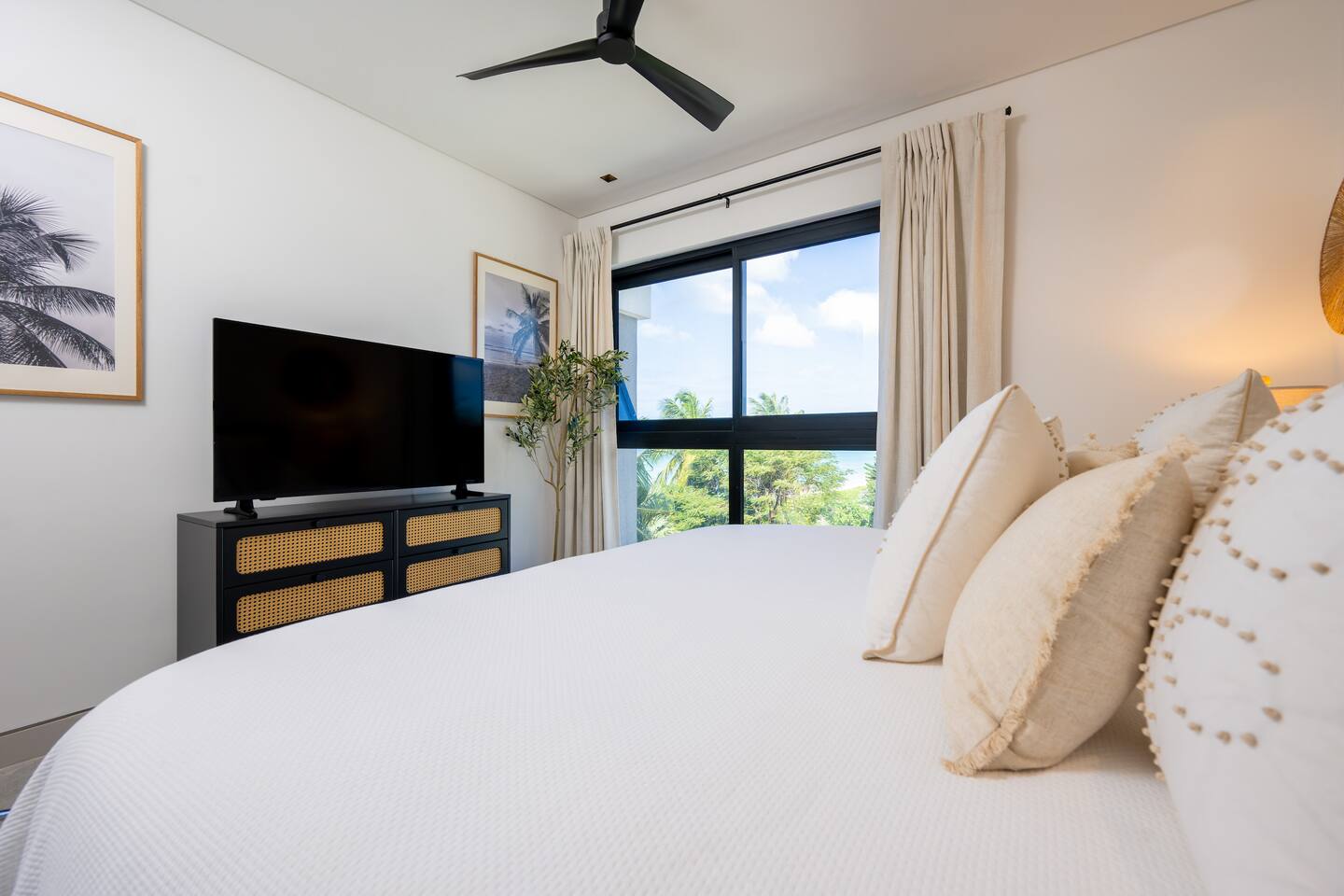 Inside, this three-bedroom, third-floor residence leans into a sleek modern design with clean lines, ocean-facing glass doors, and carefully selected finishes that feel both elevated and inviting. The open-plan kitchen and living area flow seamlessly onto the sea-facing terrace. At the same time, the master and guest bedrooms offer complete comfort, each with en-suite bathrooms, air conditioning, and ceiling fans for optimal airflow.
