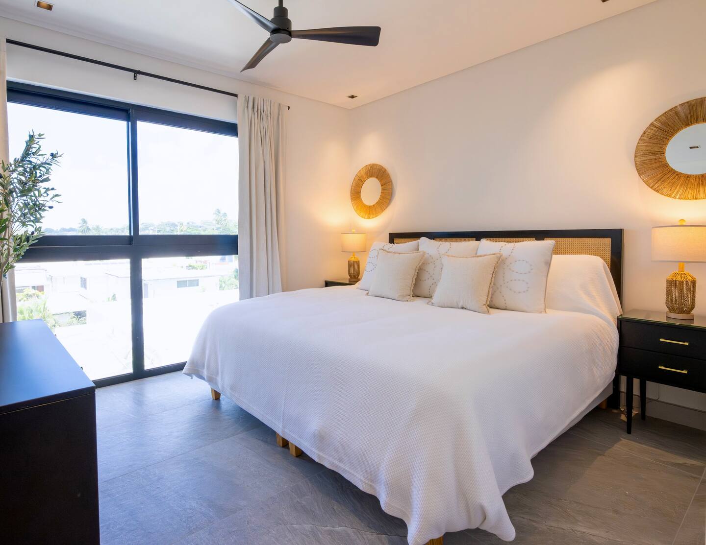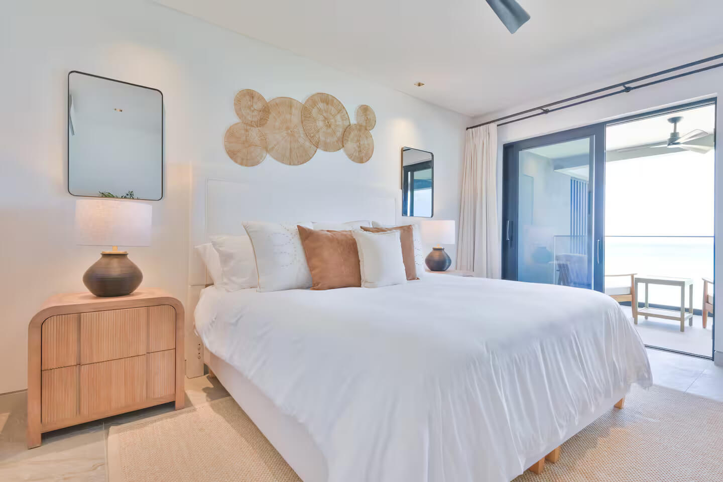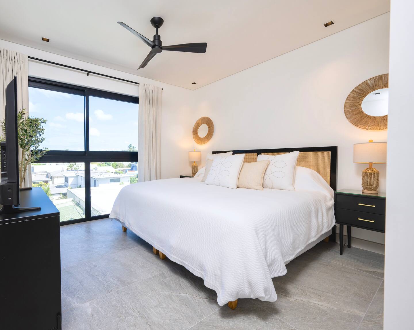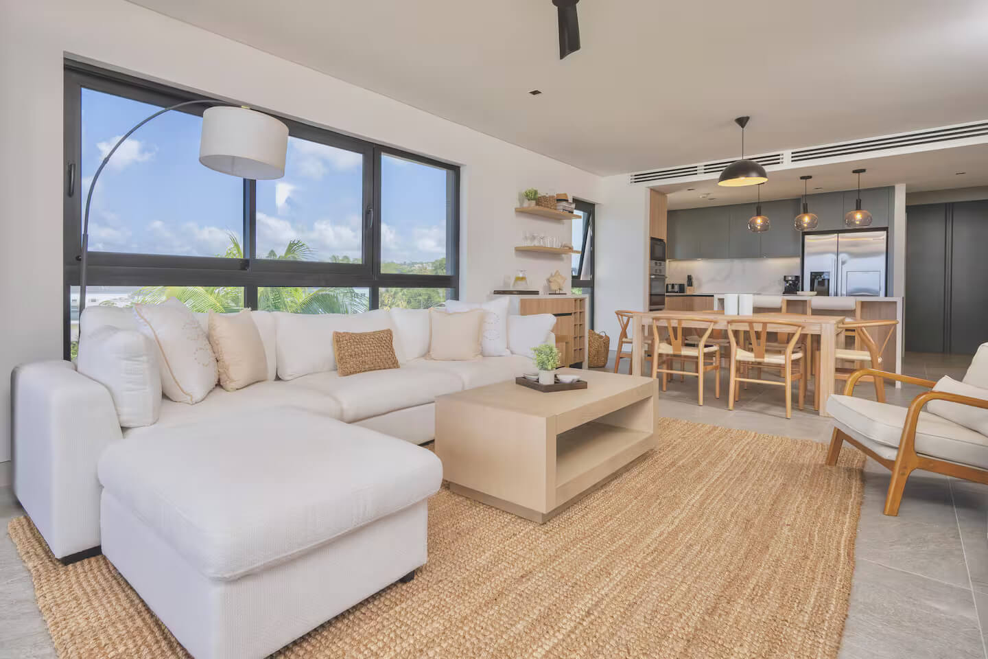 Inside, this three-bedroom, third-floor residence leans into a sleek modern design with clean lines, ocean-facing glass doors, and carefully selected finishes that feel both elevated and inviting. The open-plan kitchen and living area flow seamlessly onto the sea-facing terrace. At the same time, the master and guest bedrooms offer complete comfort, each with en-suite bathrooms, air conditioning, and ceiling fans for optimal airflow.