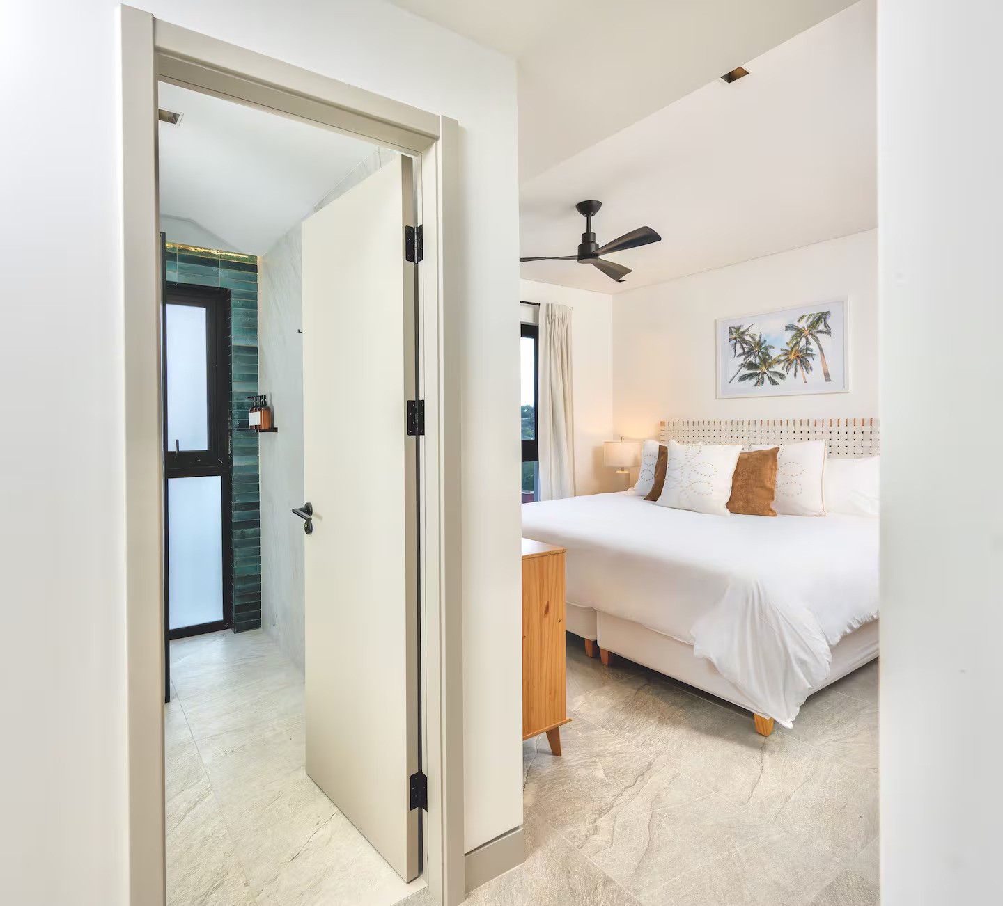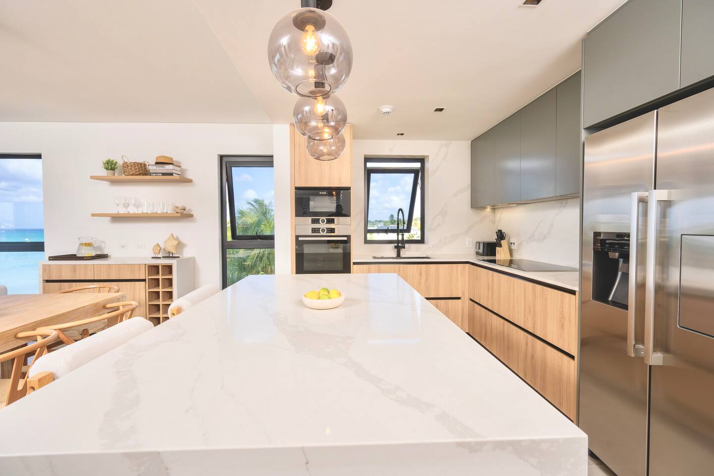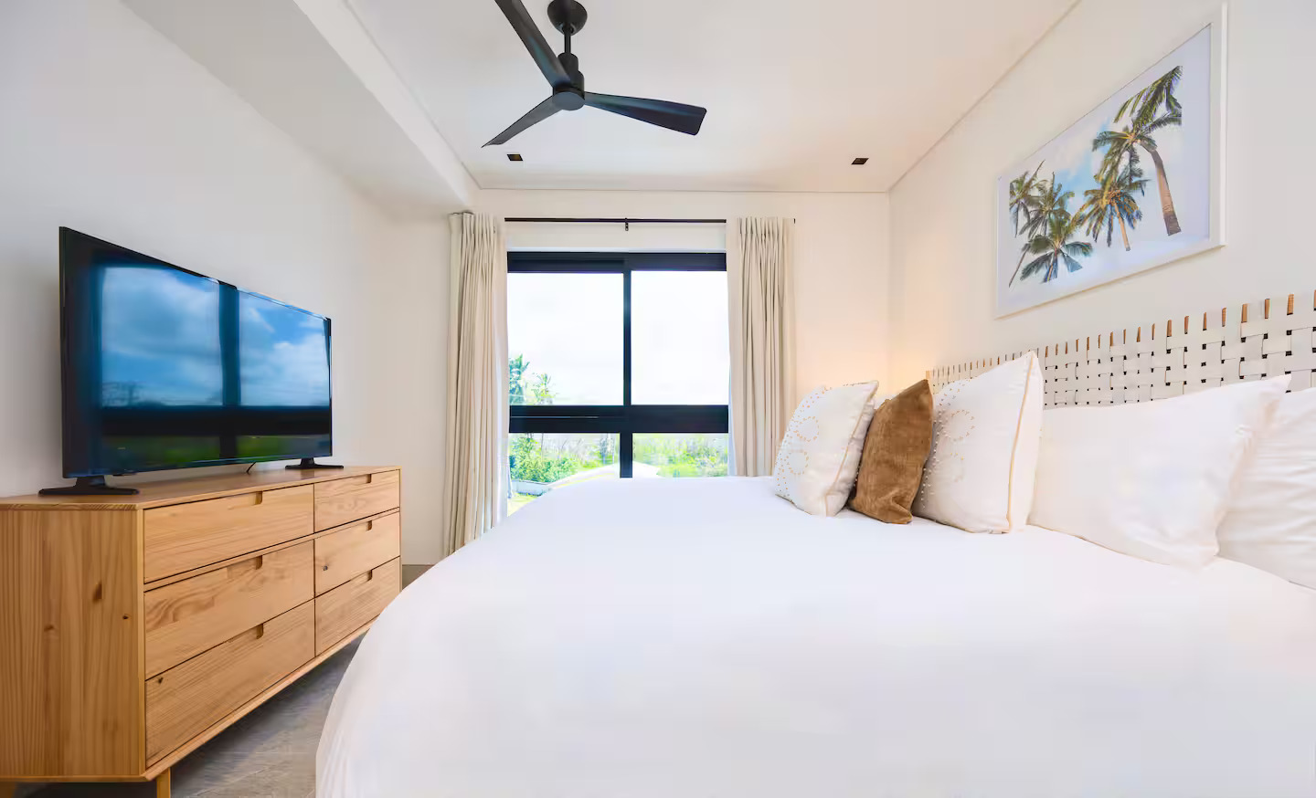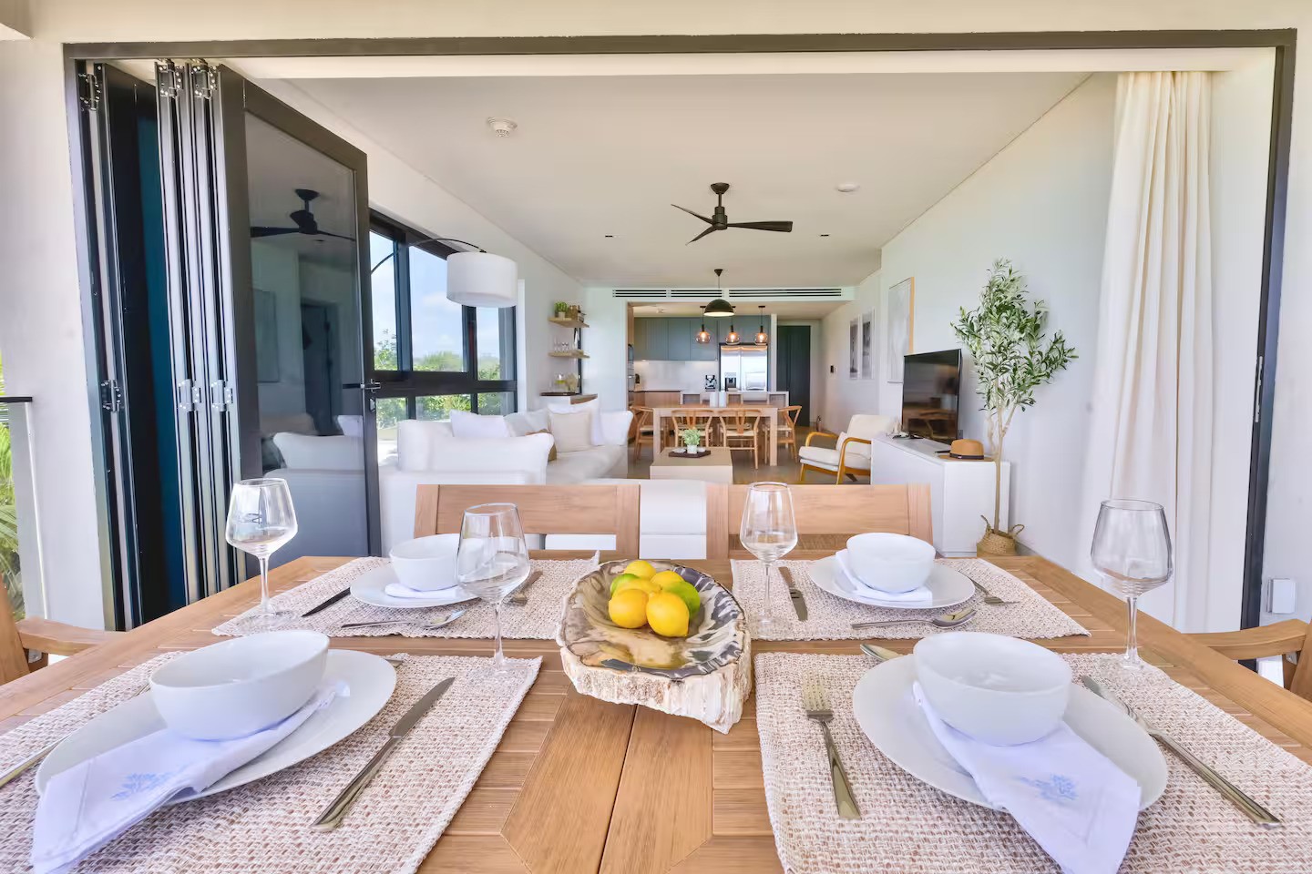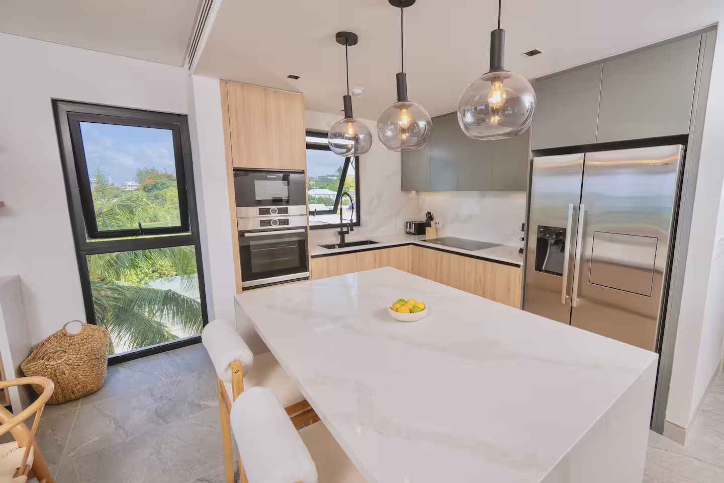 Inside, this three-bedroom, third-floor residence leans into a sleek modern design with clean lines, ocean-facing glass doors, and carefully selected finishes that feel both elevated and inviting. The open-plan kitchen and living area flow seamlessly onto the sea-facing terrace. At the same time, the master and guest bedrooms offer complete comfort, each with en-suite bathrooms, air conditioning, and ceiling fans for optimal airflow.
