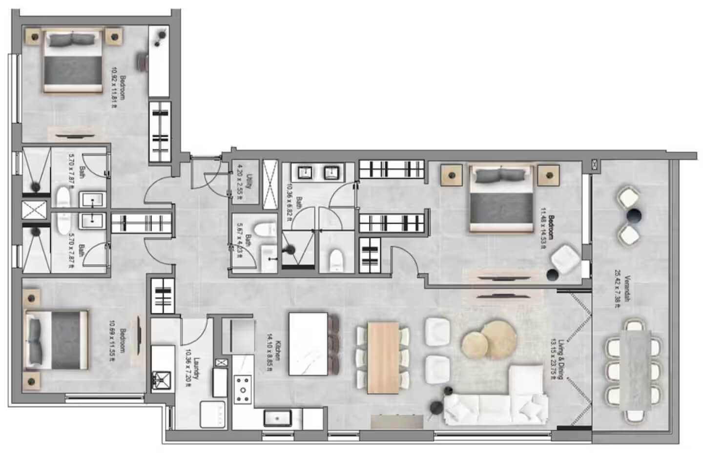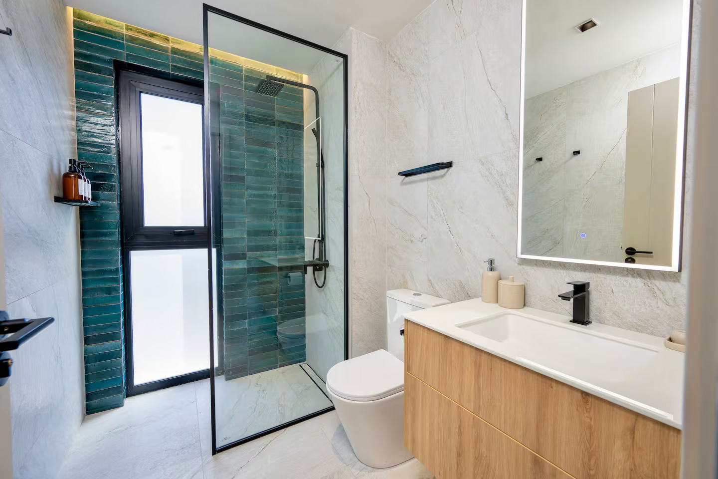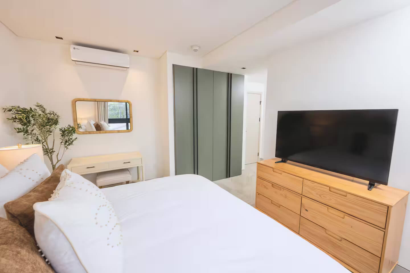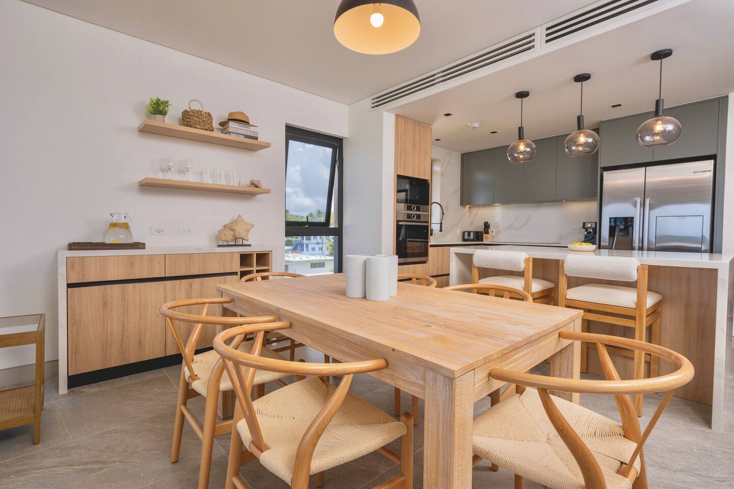 Inside, this three-bedroom, third-floor residence leans into a sleek modern design with clean lines, ocean-facing glass doors, and carefully selected finishes that feel both elevated and inviting. The open-plan kitchen and living area flow seamlessly onto the sea-facing terrace. At the same time, the master and guest bedrooms offer complete comfort, each with en-suite bathrooms, air conditioning, and ceiling fans for optimal airflow.