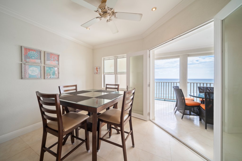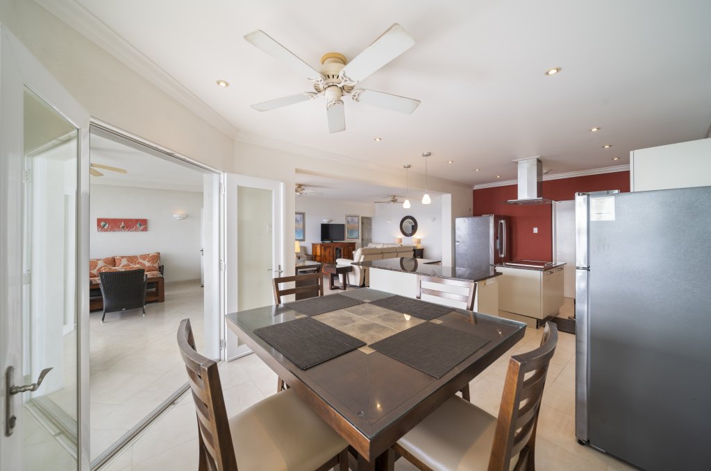 The living and dining area opens straight onto a deep, covered terrace through full-height sliding doors. This is where the apartment really earns its keep. The view stretches across the Caribbean Sea with nothing between you and the water but sand and sky. Morning coffee, long lunches, sunset drinks, it all happens here. The terrace becomes an extension of the living space and a front-row seat to South Coast life.
