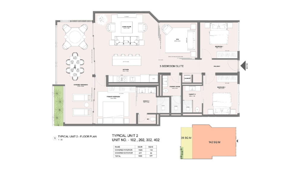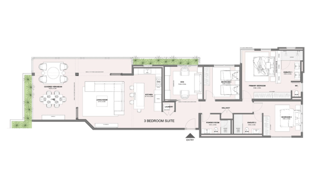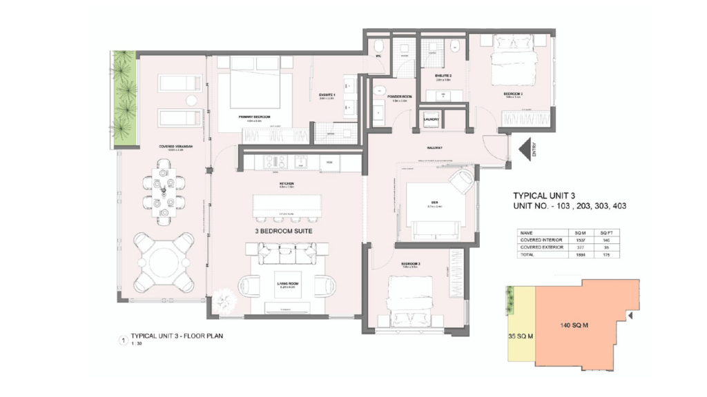 Set amid lush tropical landscaping, these residences blend privacy with natural beauty. Green terraces and integrated planters surround the spaces, softening the modern structure and connecting each home with nature. Perfect for those who prefer shaded tranquillity and a strong sense of seclusion. - Type Three