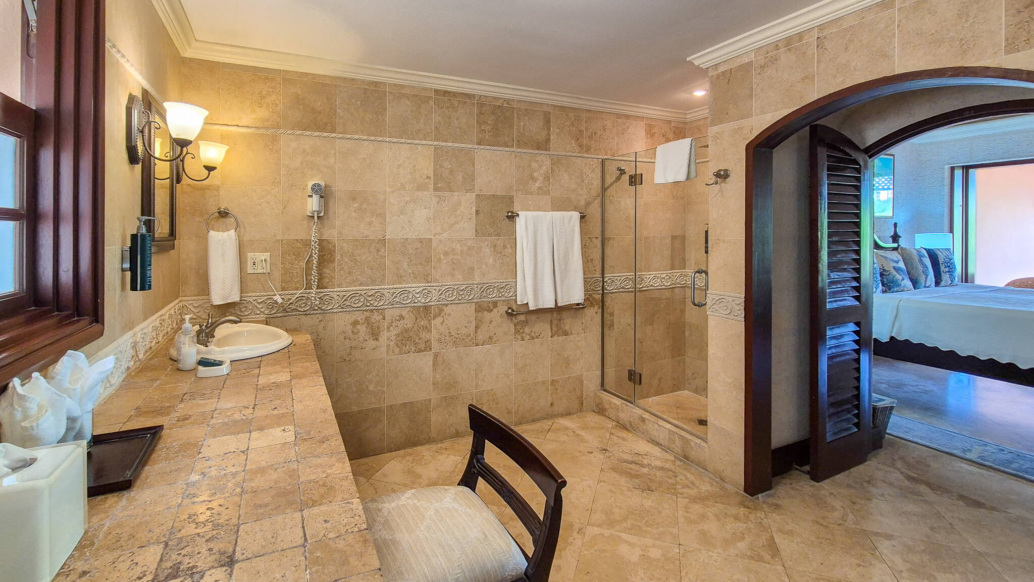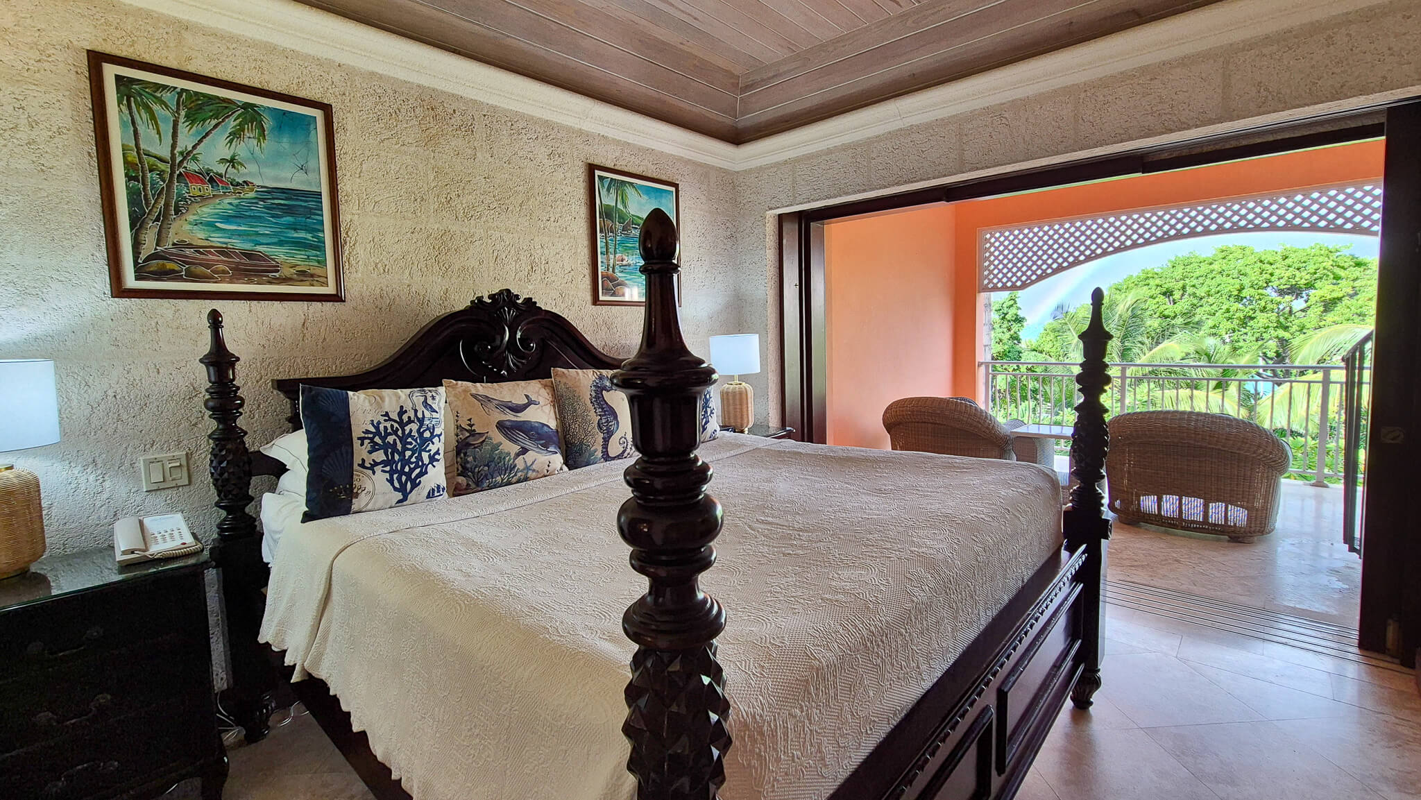 Inside, the penthouse has a bright, airy feel thanks to high ceilings, Crane coral stone walls, and artisan mahogany furnishings. You’ll find a fully equipped granite kitchen, generous living and dining spaces, and oversized sofas that invite you to stay a while. The bedroom features a king-sized bed and opens onto a spacious private balcony with lush garden views — the perfect spot for your morning coffee or evening cocktail.