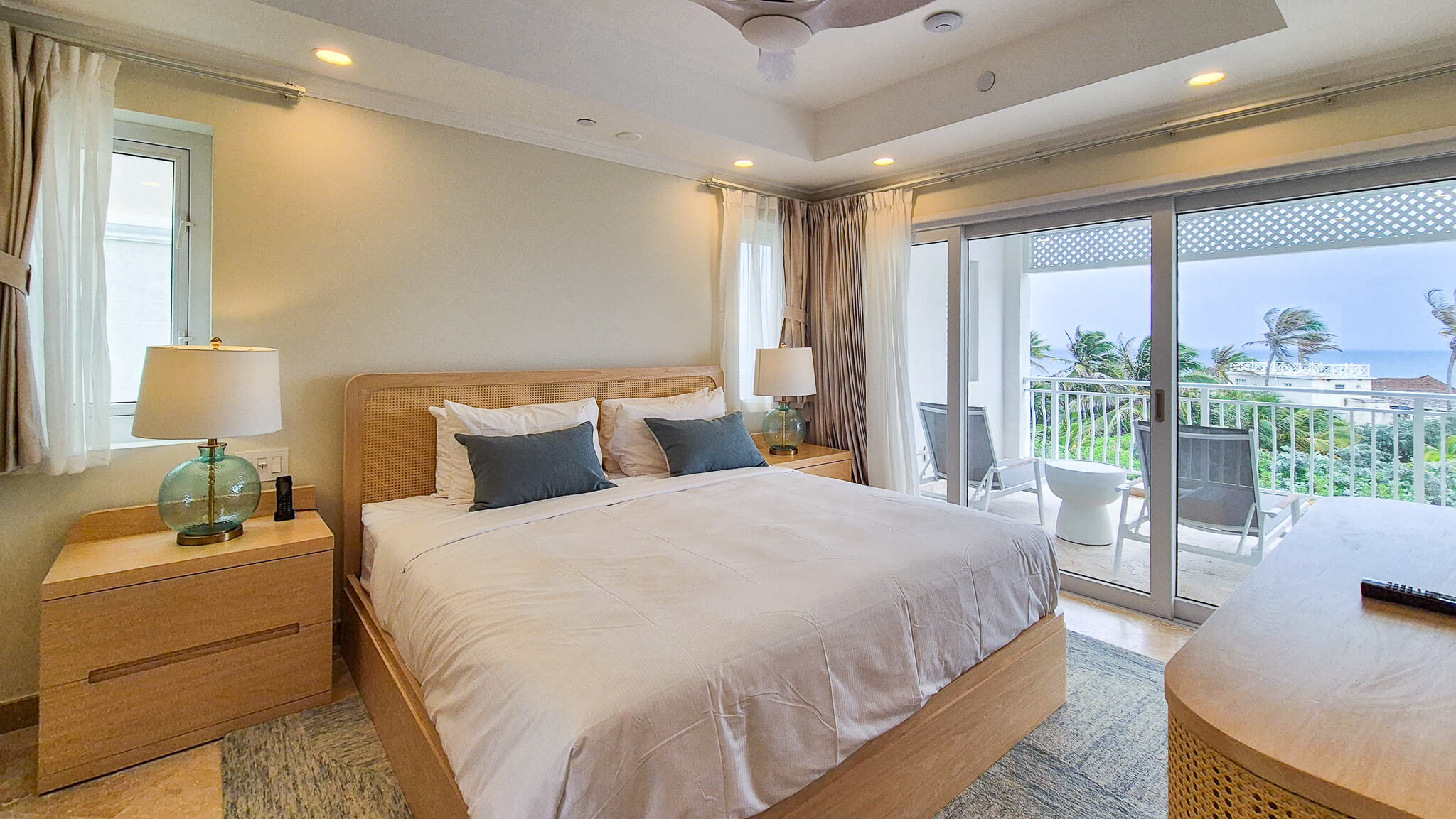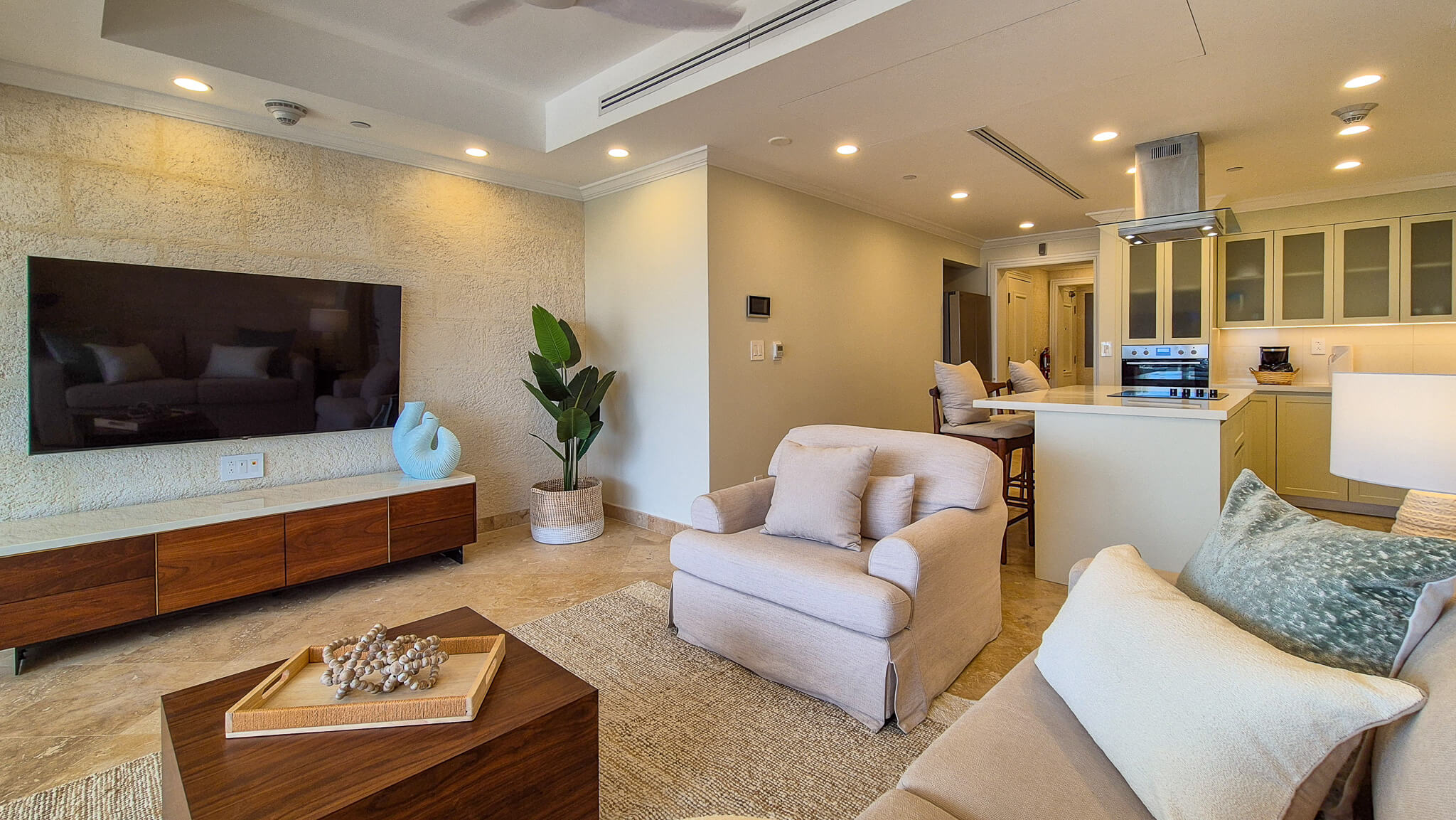 Step through the door and you’re immediately greeted by The Crane’s signature coral stone walls and a wash of natural light. The open-plan layout flows seamlessly from the kitchen through the living area to a spacious covered balcony — your private front-row seat to the ever-changing blues of the Atlantic.