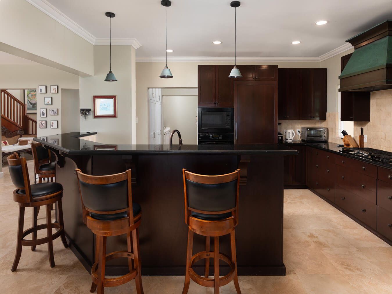 The open-plan kitchen is spacious, well-laid out, and equipped with GE and Sub-Zero appliances, ample storage, and a walk-in pantry. A cheerful breakfast room flows effortlessly onto the patio, where you’ll enjoy coffee with a breeze and sweeping coastal views. The adjacent laundry room is equally functional, with ample storage and direct access to the enclosed two-car garage.