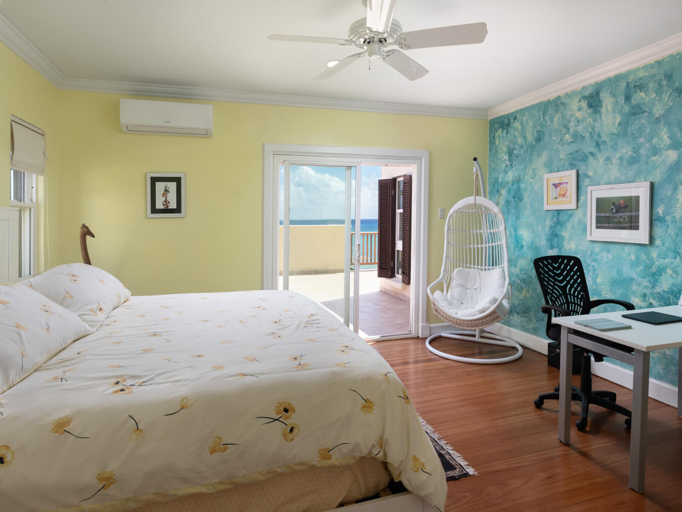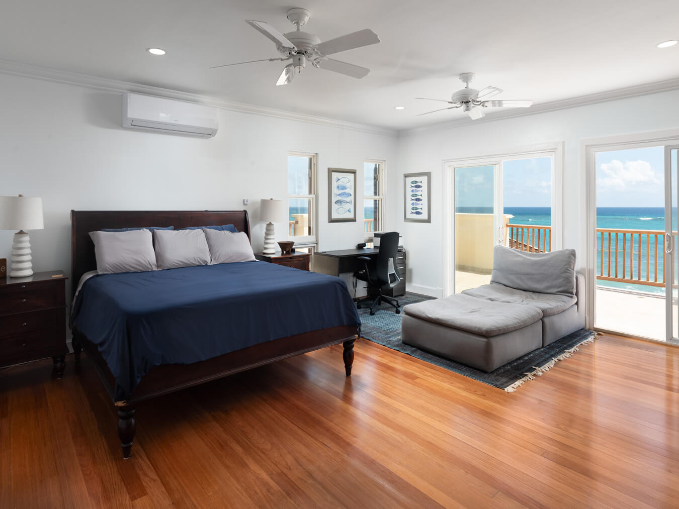 On the ground floor, a spacious, air-conditioned guest suite offers easy access and has been designed with wheelchair accessibility in mind. Upstairs, three further en-suite bedrooms include walk-in closets, air conditioning, and spectacular views. The primary suite enjoys a private oceanfront terrace—perfect for morning yoga or a quiet evening glass of wine. One of the additional guest bedrooms also shares this terrace, as well as the stunning seascape beyond.
