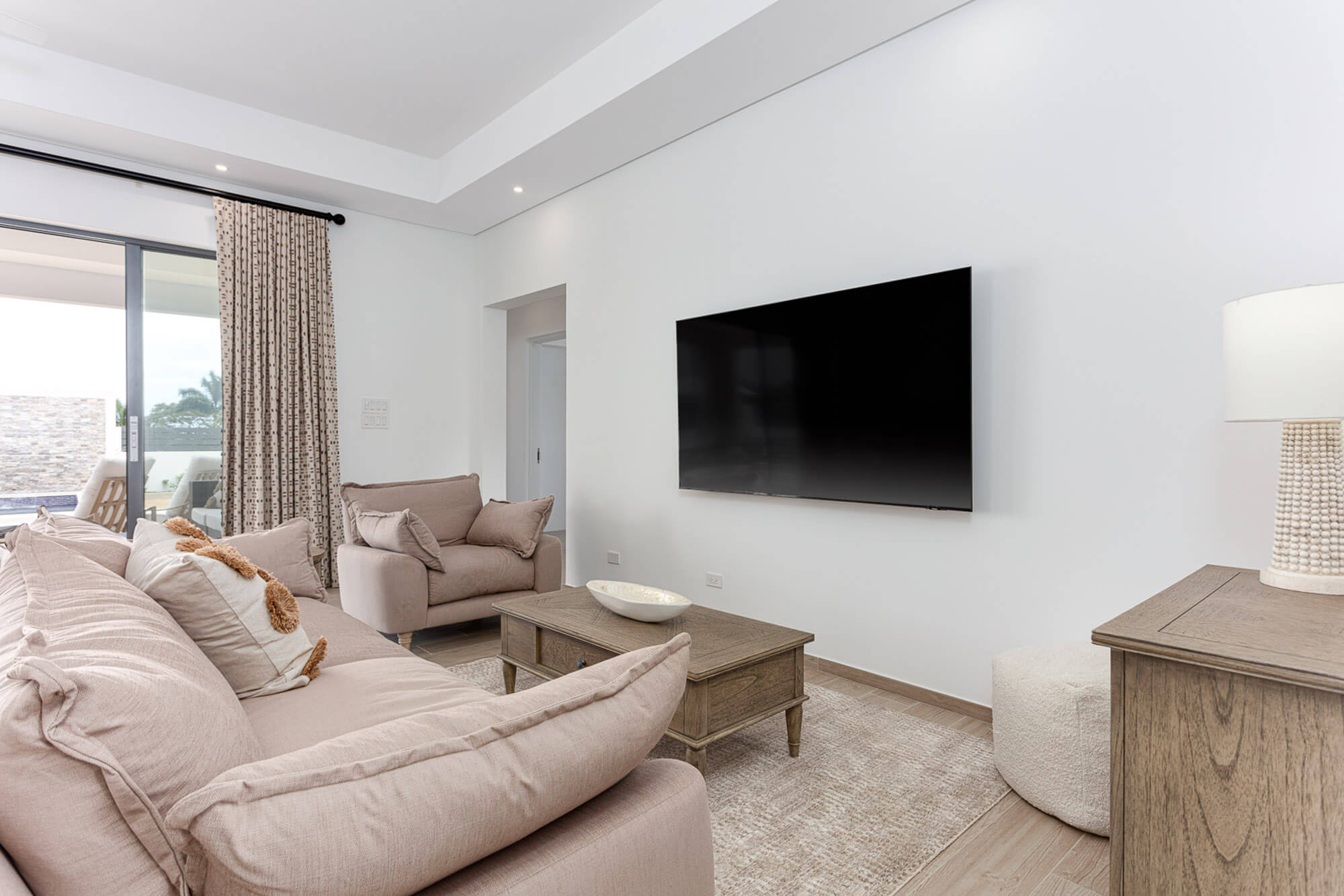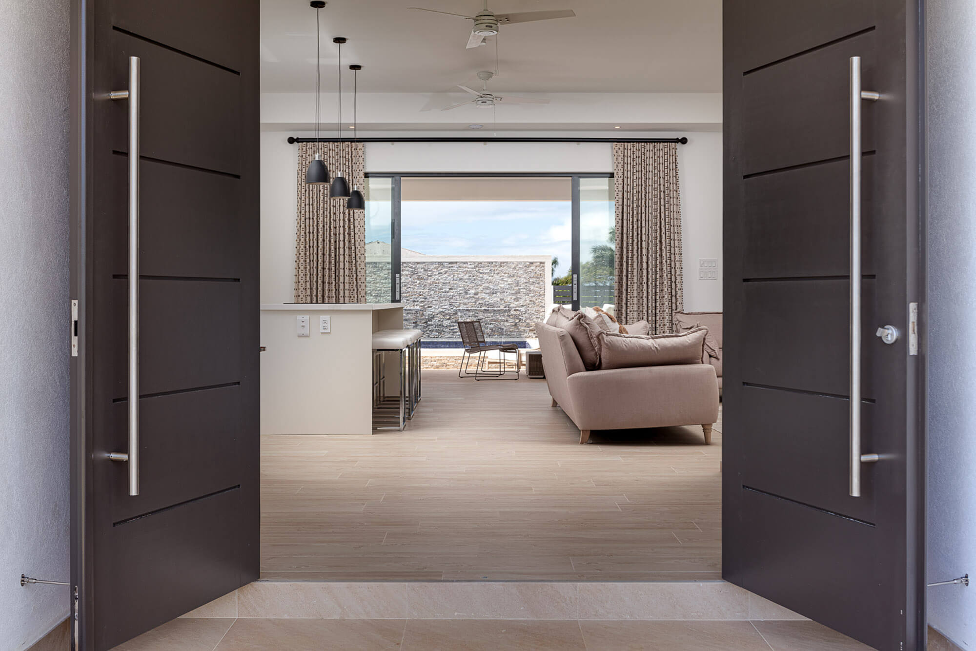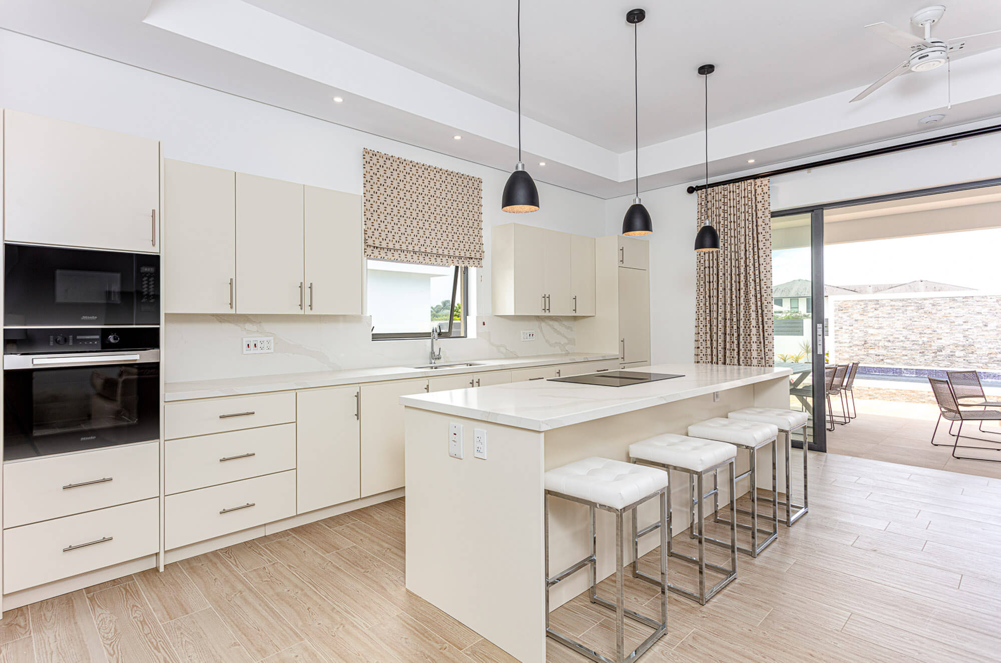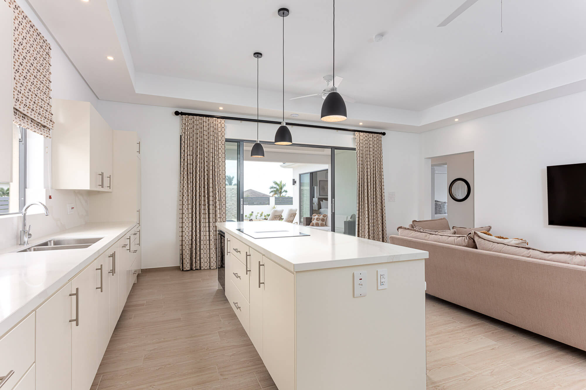 This thoughtfully laid-out villa spans 1,900 square feet and is all about flow and functionality. Step inside and you’re greeted by open-plan living spaces bathed in natural light, with large sliding glass doors that open straight onto the pool deck from both the living room and the primary suite. It’s a seamless transition from indoor comfort to outdoor lounging—whether you’re hosting cocktails poolside or enjoying a quiet morning coffee in the sun.