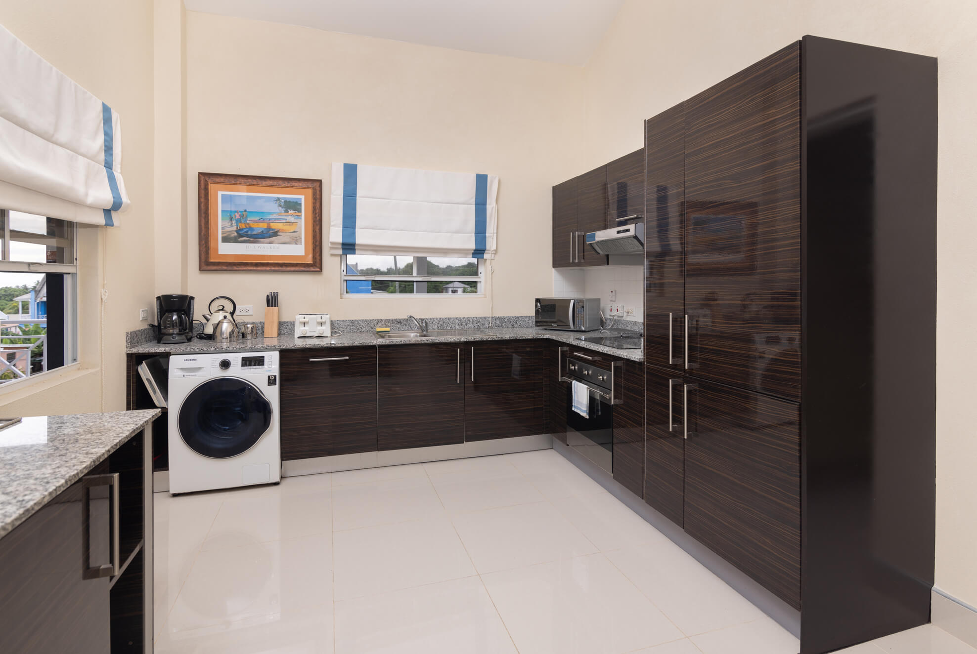 Lantana 45 offers a bright, open-plan layout with seamless indoor-outdoor flow. The spacious kitchen, living, and dining area opens out onto a large private terrace—perfect for al fresco dining or sundowners with sweeping views over the Caribbean Sea and the Weston coastline. Each of the three bedrooms is air-conditioned, while ceiling fans throughout keep the space breezy and cool.