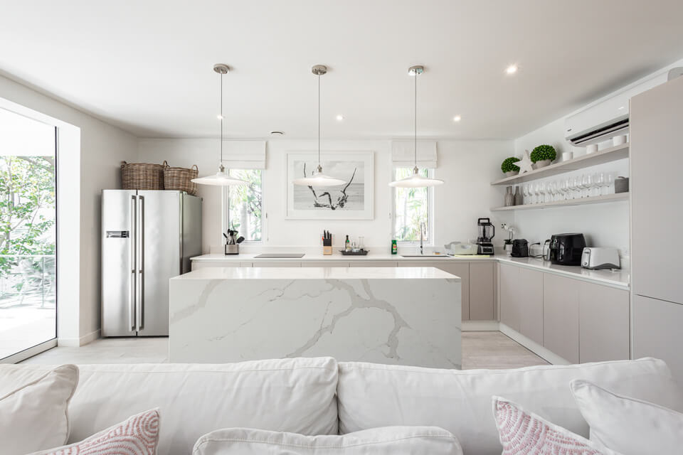 From the moment you walk into the foyer, you’ll appreciate the clean lines, generous proportions, and thoughtful layout. The open-plan kitchen, dining, and living area is air-conditioned for year-round comfort and outfitted with Smeg appliances, a granite-topped island with bar seating, and sleek cabinetry—perfect for casual entertaining or quiet evenings at home.