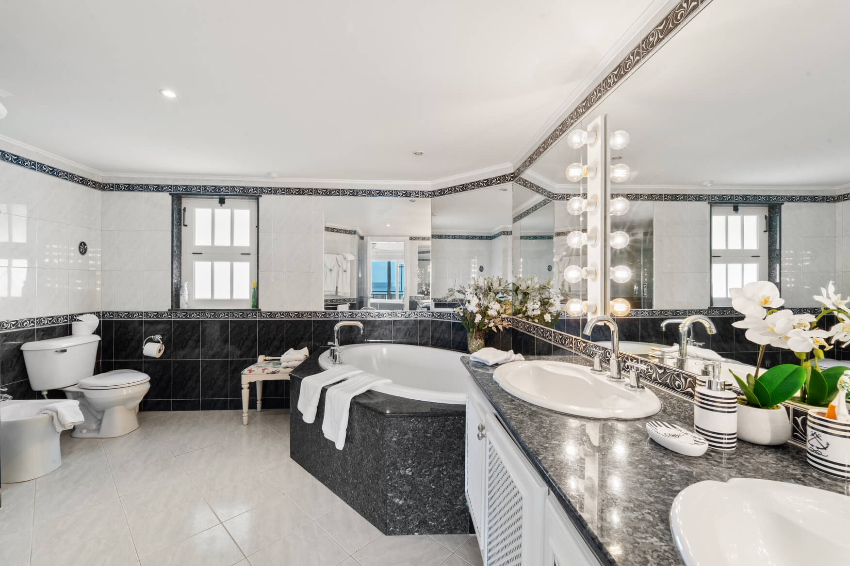 Inside, the master suite is a true sanctuary. It features a king-sized bed, a walk-in closet, and a spacious en-suite with both a jacuzzi tub and a separate shower. The private balcony is ideal for morning coffee or evening sunsets. The guest bedroom is bright and flexible, with a king bed that converts to twins and direct access to the terrace.