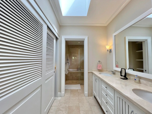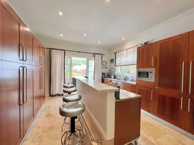The villa’s covered terrace is the kind of space you’ll use all year round – shaded for long, lazy lunches, yet open to the gardens and pool so you can move seamlessly between sun and shade. The deck has space for loungers, making it perfect for a quick dip in the pool before heading back to your book or your cocktail. Mature tropical gardens surround the property, adding to the sense of privacy.