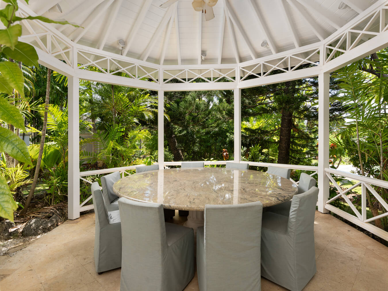 The centrepiece of Verbeia is undoubtedly the inviting outdoor living space. The covered terrace, complete with a dining area and outdoor grill, overlooks the sparkling private pool and lush gardens, with views of the 16th fairway. A pathway from the covered terrace leads into the elegant dining gazebo.